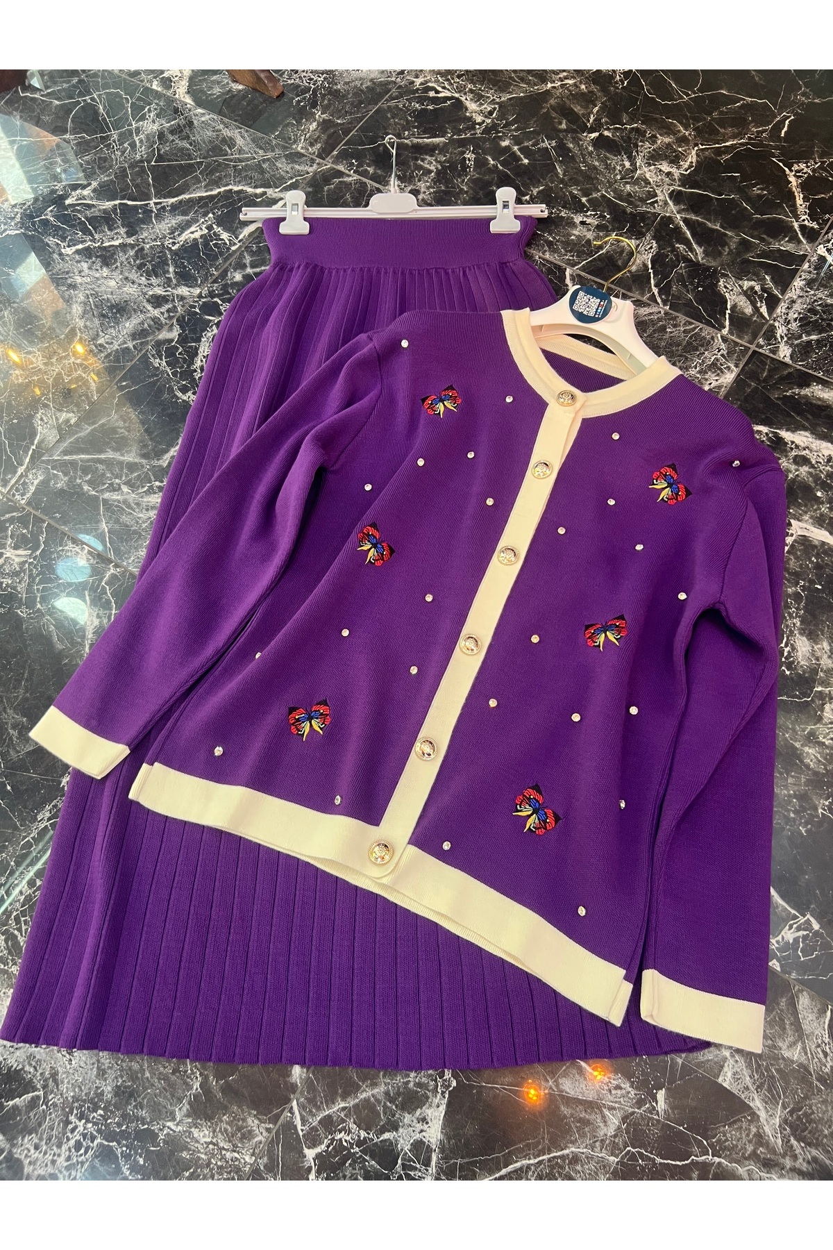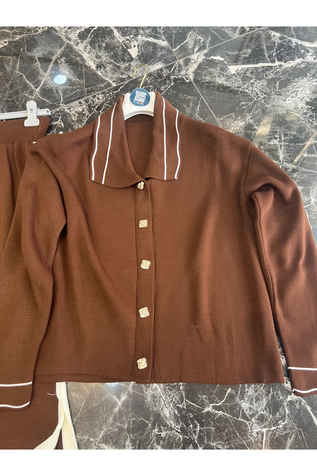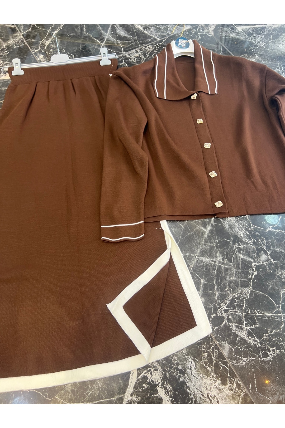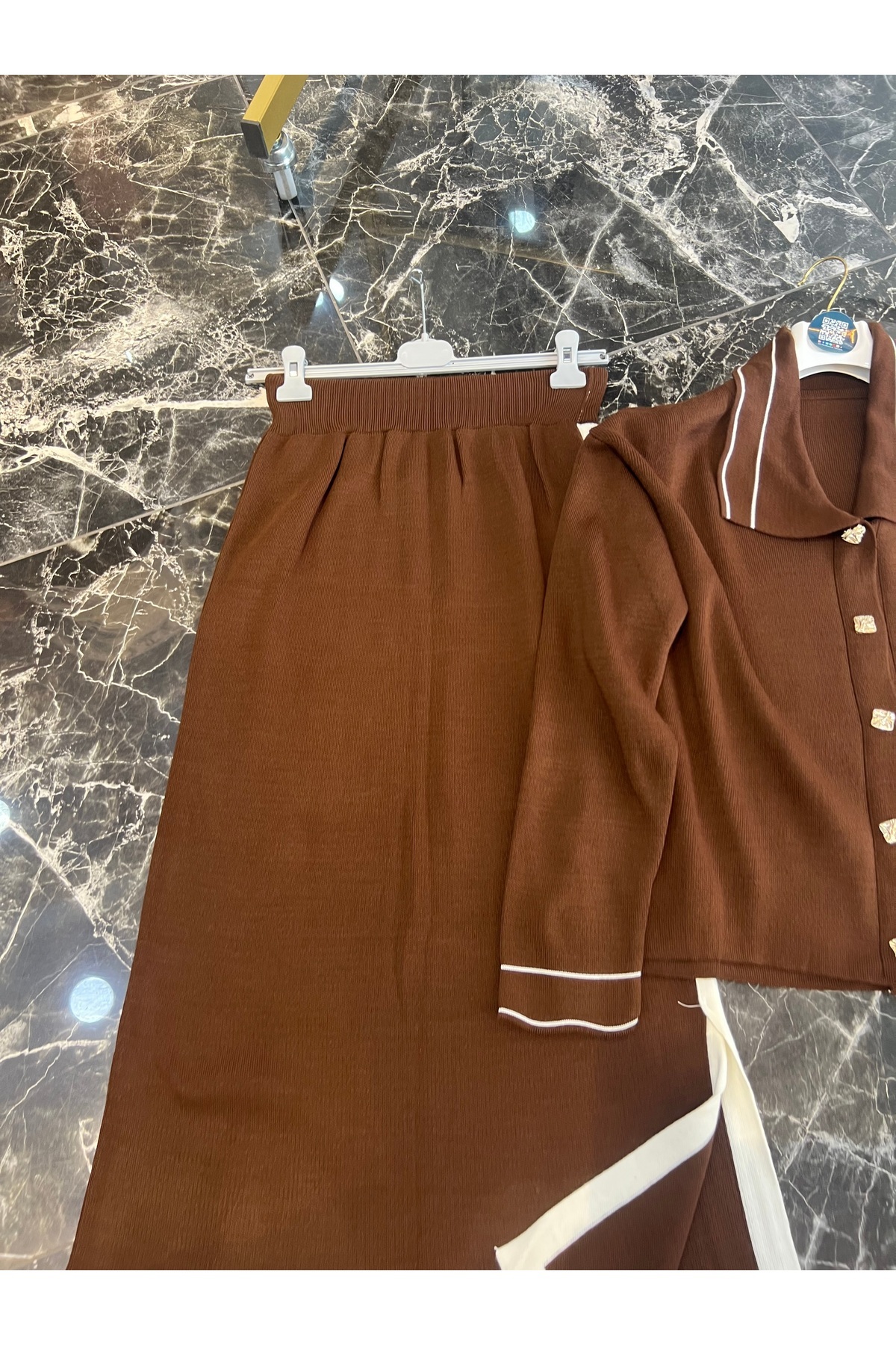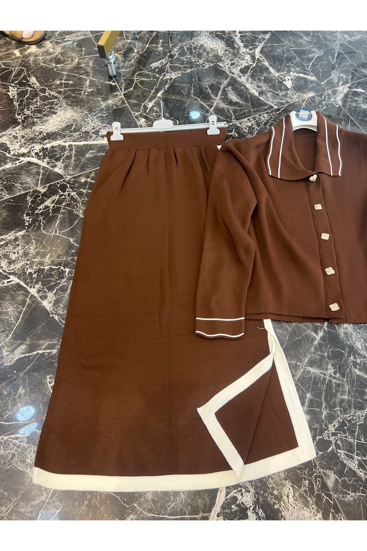 Kadın Tesettür Alt Üst Takım Çizgili Gömlek Yaka Hırka Etekli Triko Takım Kahverengi Kadın Tesettür Alt Üst Takım Çizgili Gömlek Yaka Hırka Etekli Triko Takım Kahverengi 406 تک سایز