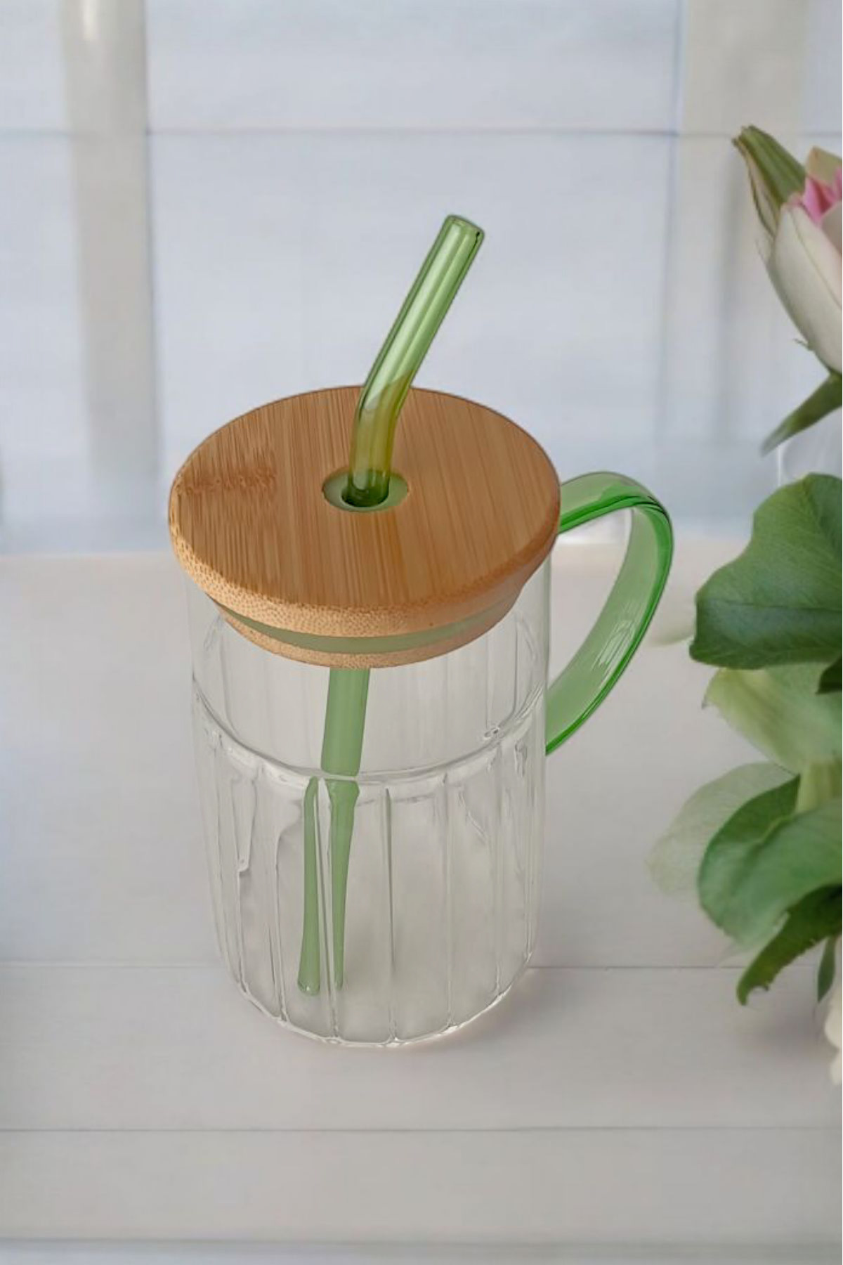 Bambu Kapaklı Cam Pipetli Kupa 420 ml | Yeşil Bambu Kapaklı Cam Pipetli Kupa 420 ml | Yeşil THN76886 تک سایز