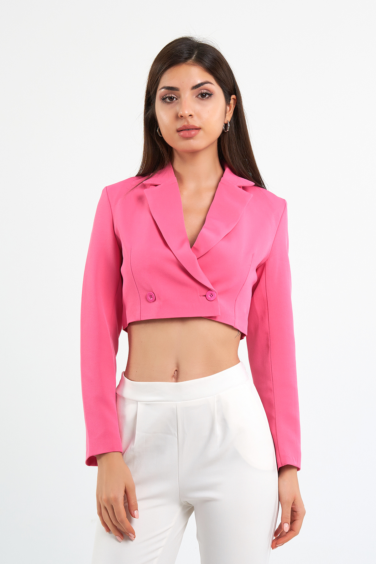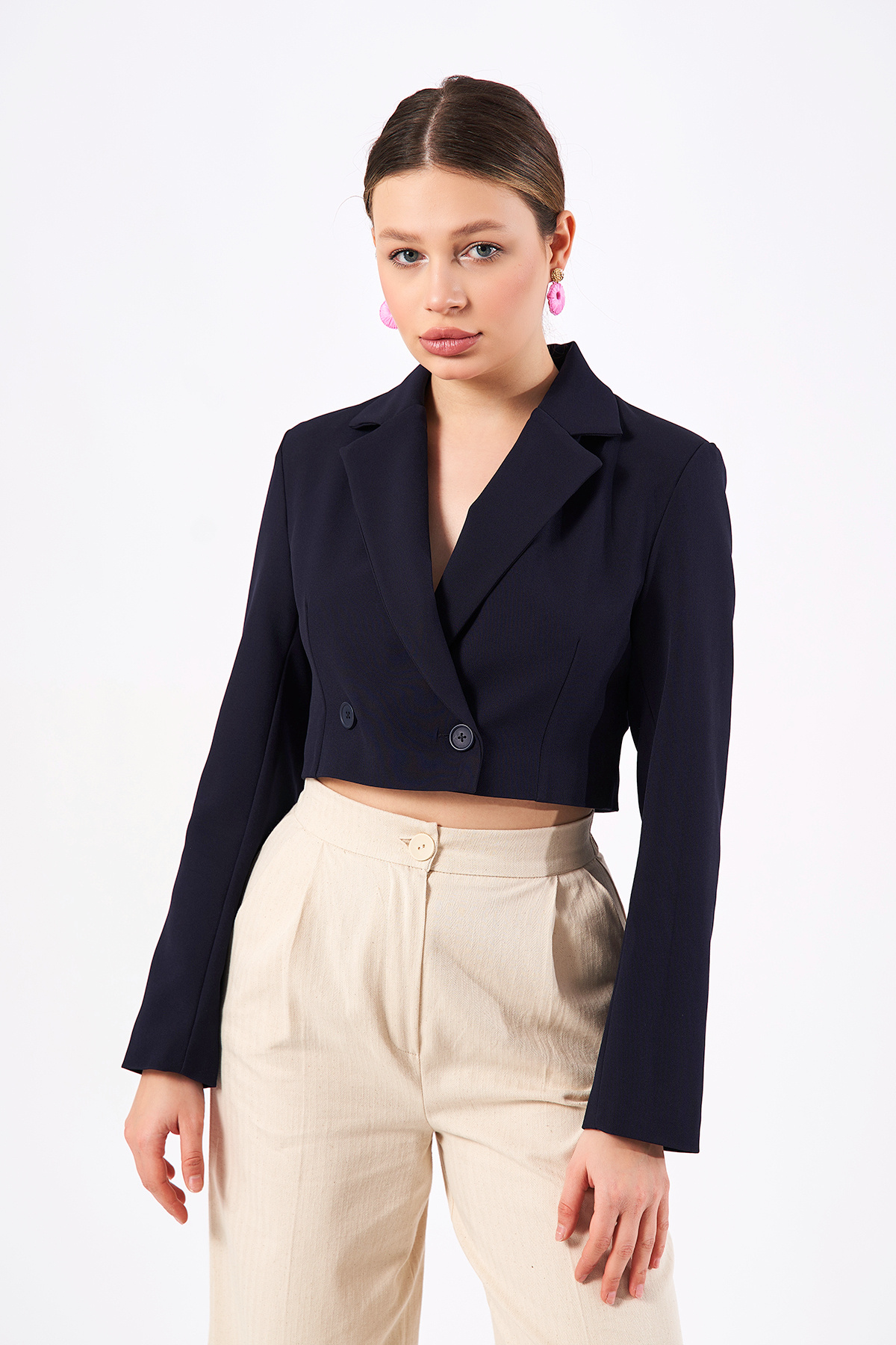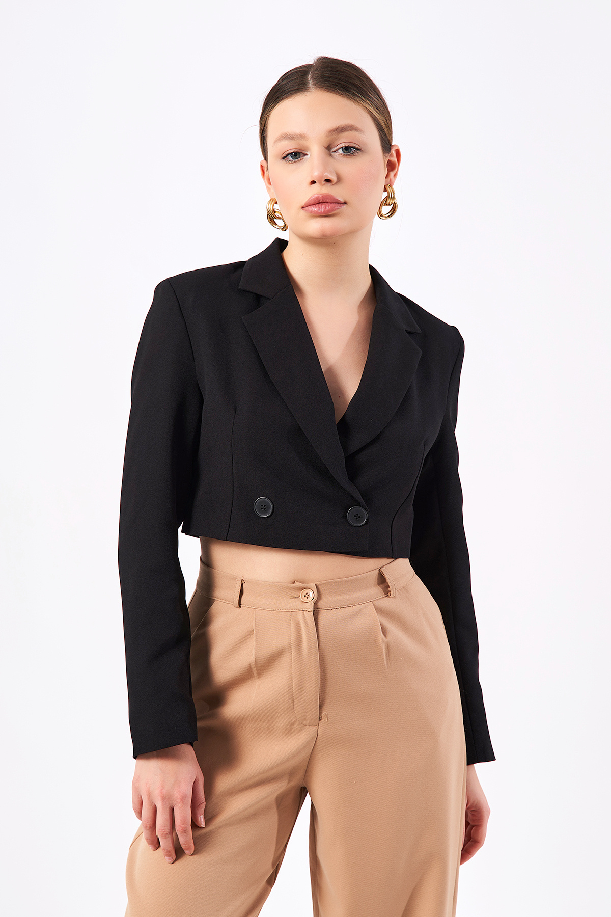 Kadın Krem Kruvaze Crop Blazer Ceket Kadın Krem Kruvaze Crop Blazer Ceket ckt-1000 L