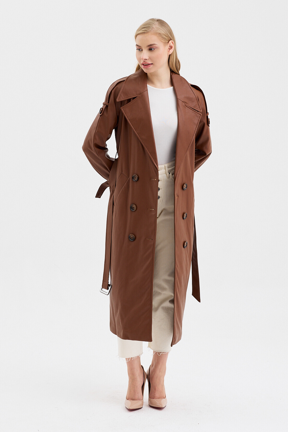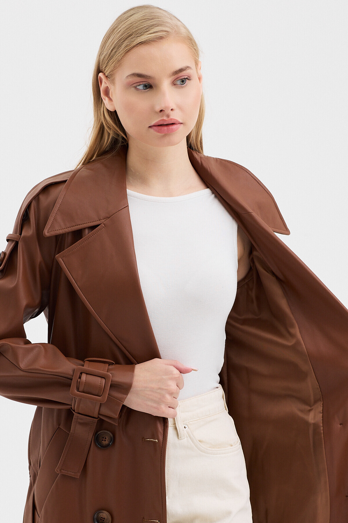 KADIN KRUVAZE KAPAMA CEP VE APOLET DETAYLI DERİ KAHVERENGİ TRENÇKOT KADIN KRUVAZE KAPAMA CEP VE APOLET DETAYLI DERİ KAHVERENGİ TRENÇKOT 6137 42