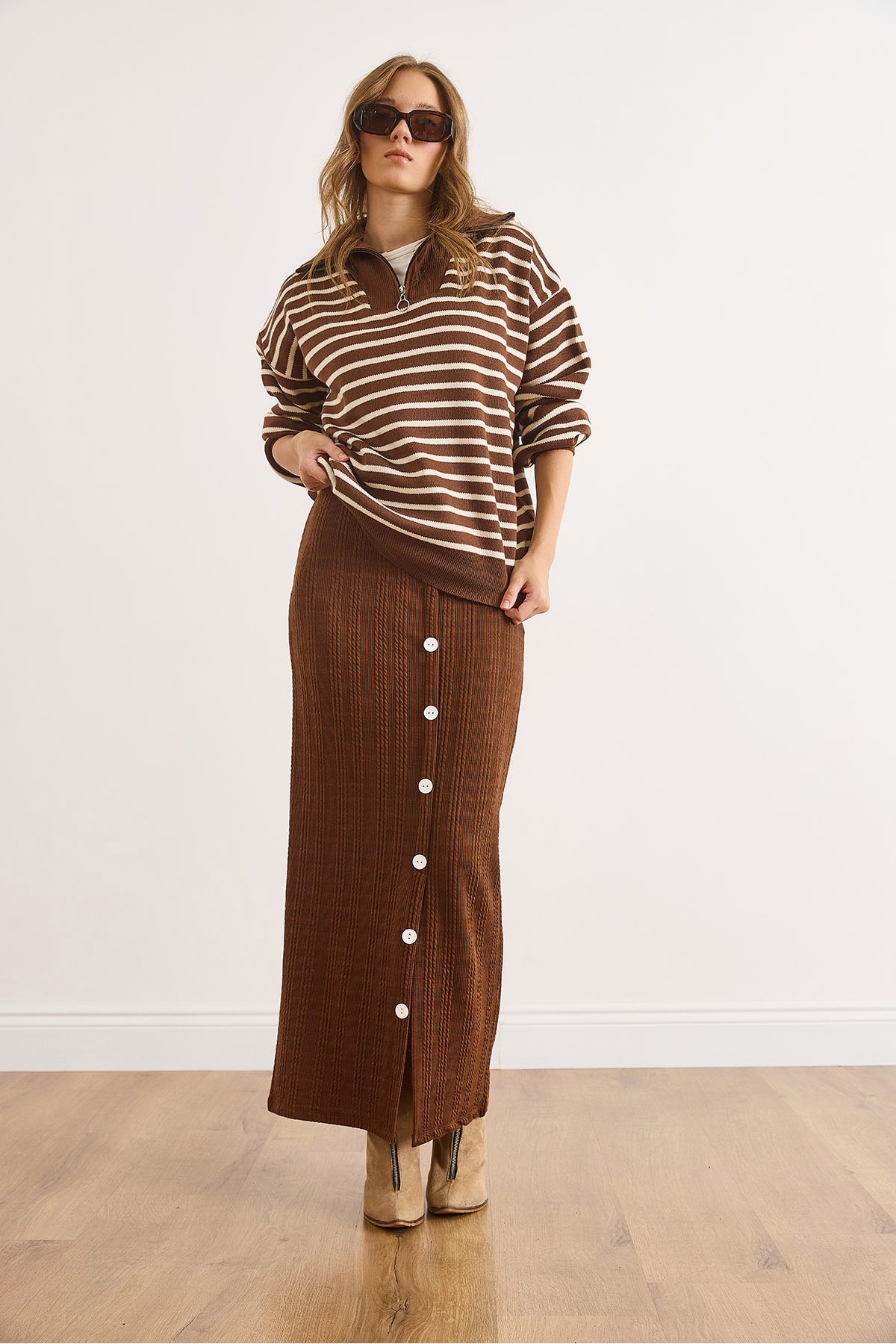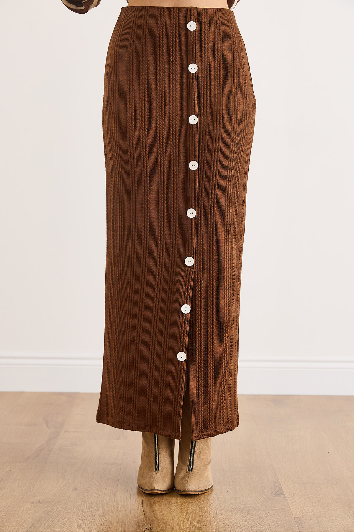Kadın Acı Kahve Beli Lastikli Düğmeli Yırtmaçlı Uzun Etek ETK-19000293 Kadın Acı Kahve Beli Lastikli Düğmeli Yırtmaçlı Uzun Etek ETK-19000293 L/XL