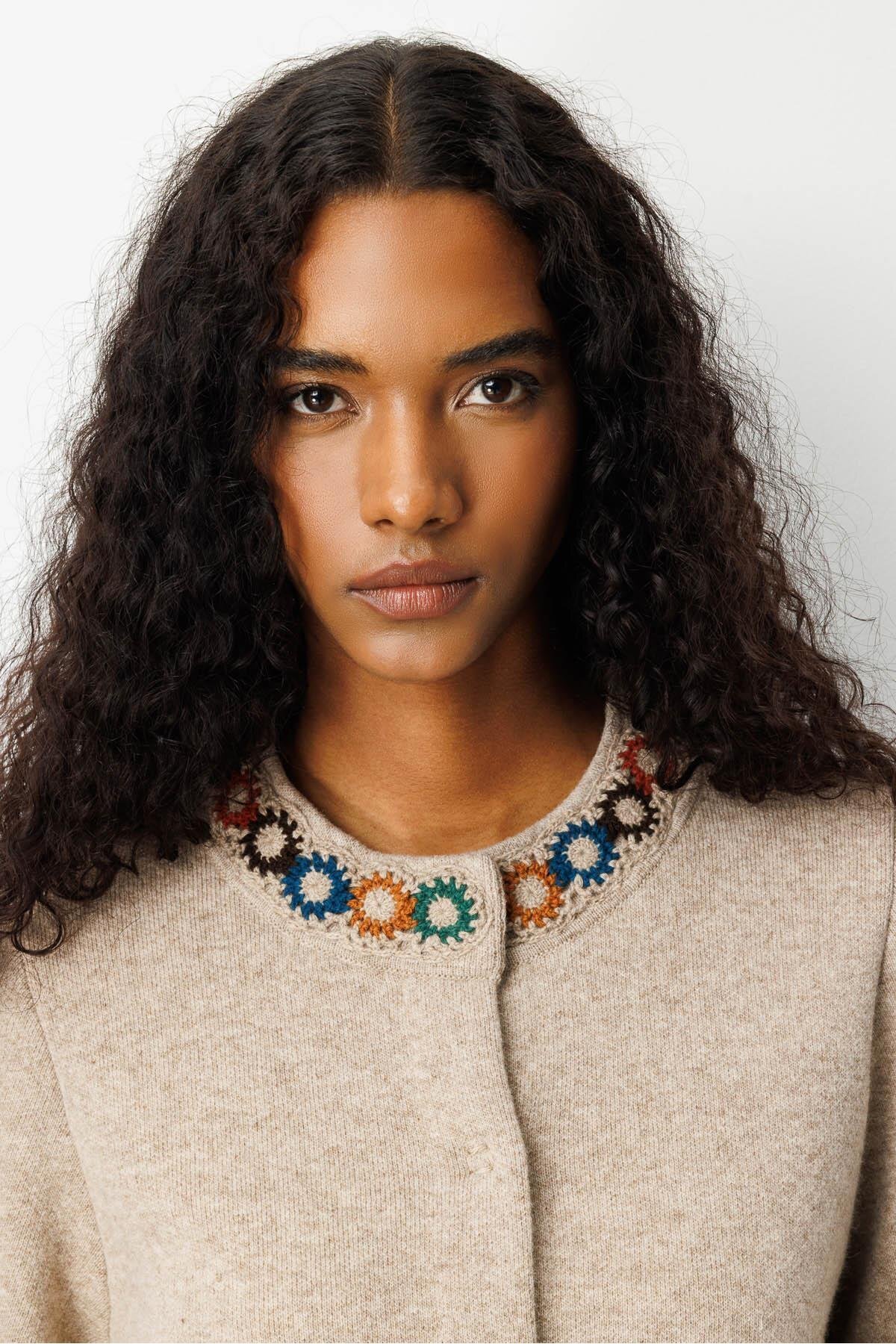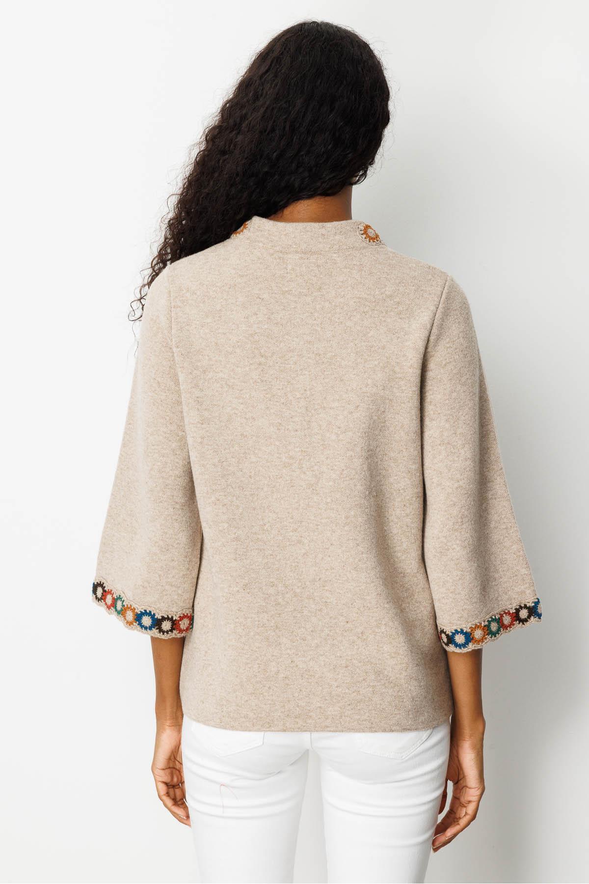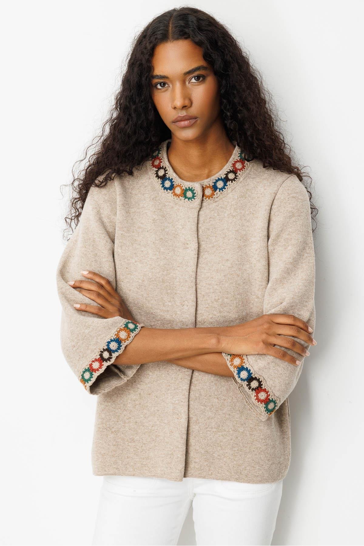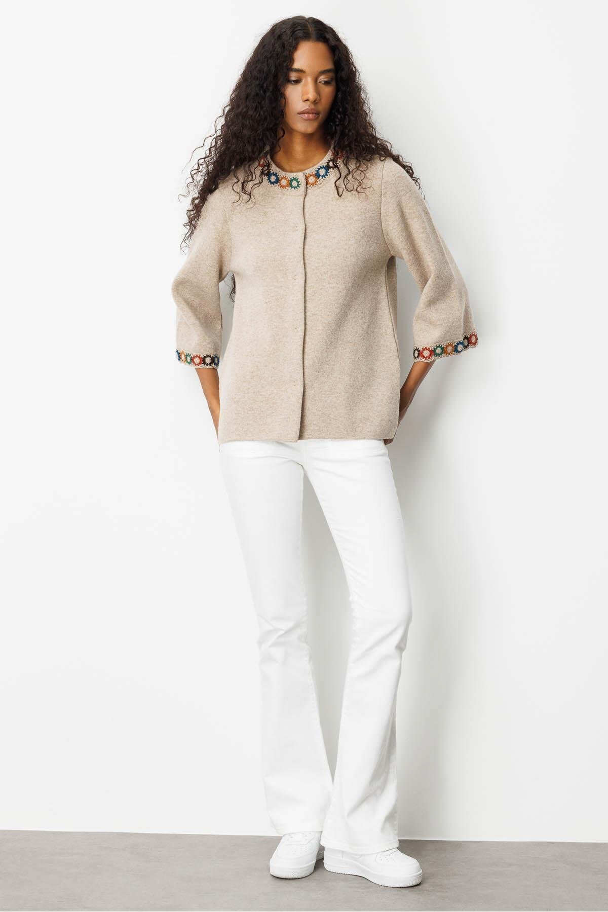 Kadın Yakası ve Kol Ağzı Tığlamalı Kısa Yün Ceket K.Bej Kadın Yakası ve Kol Ağzı Tığlamalı Kısa Yün Ceket K.Bej 25022 XL