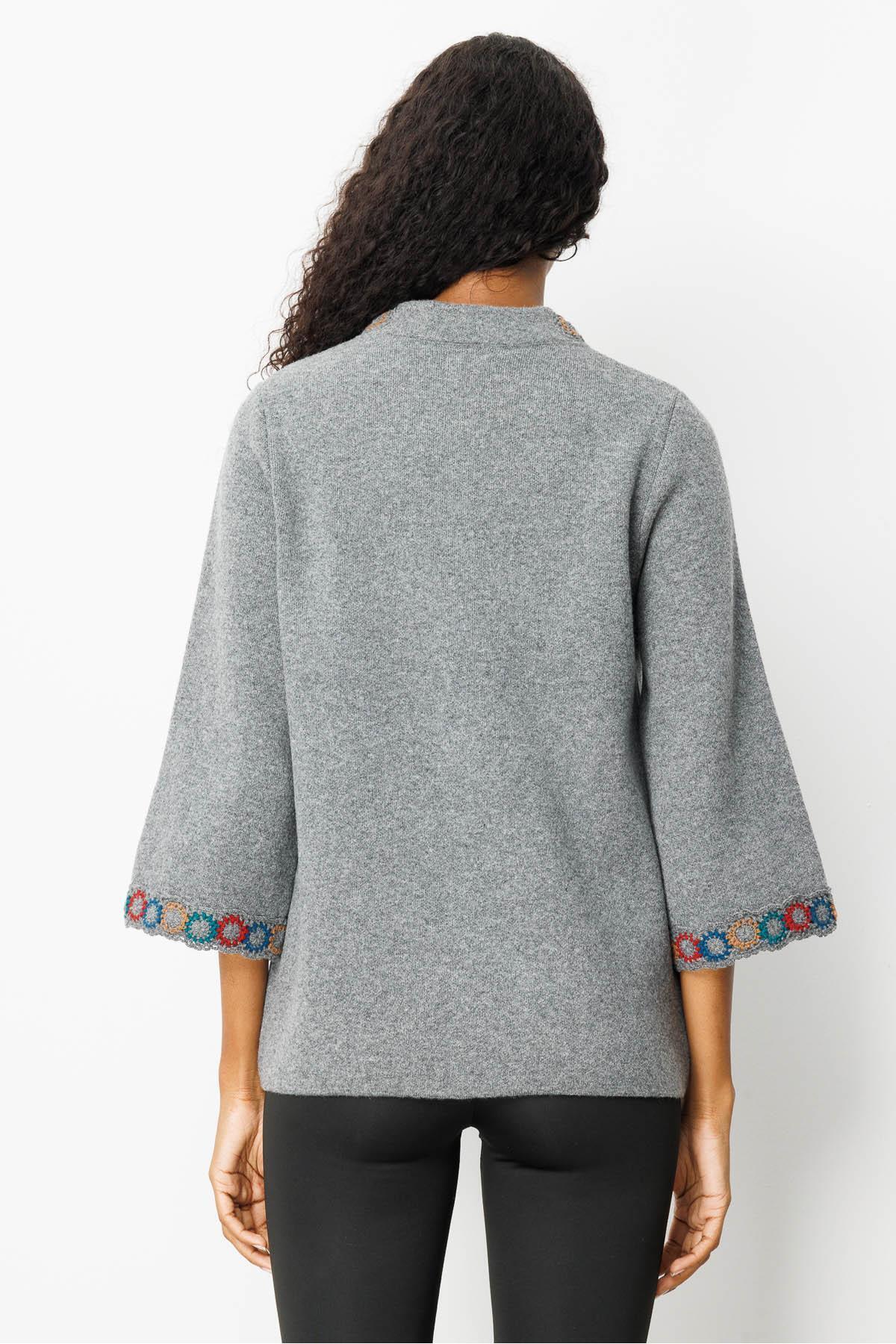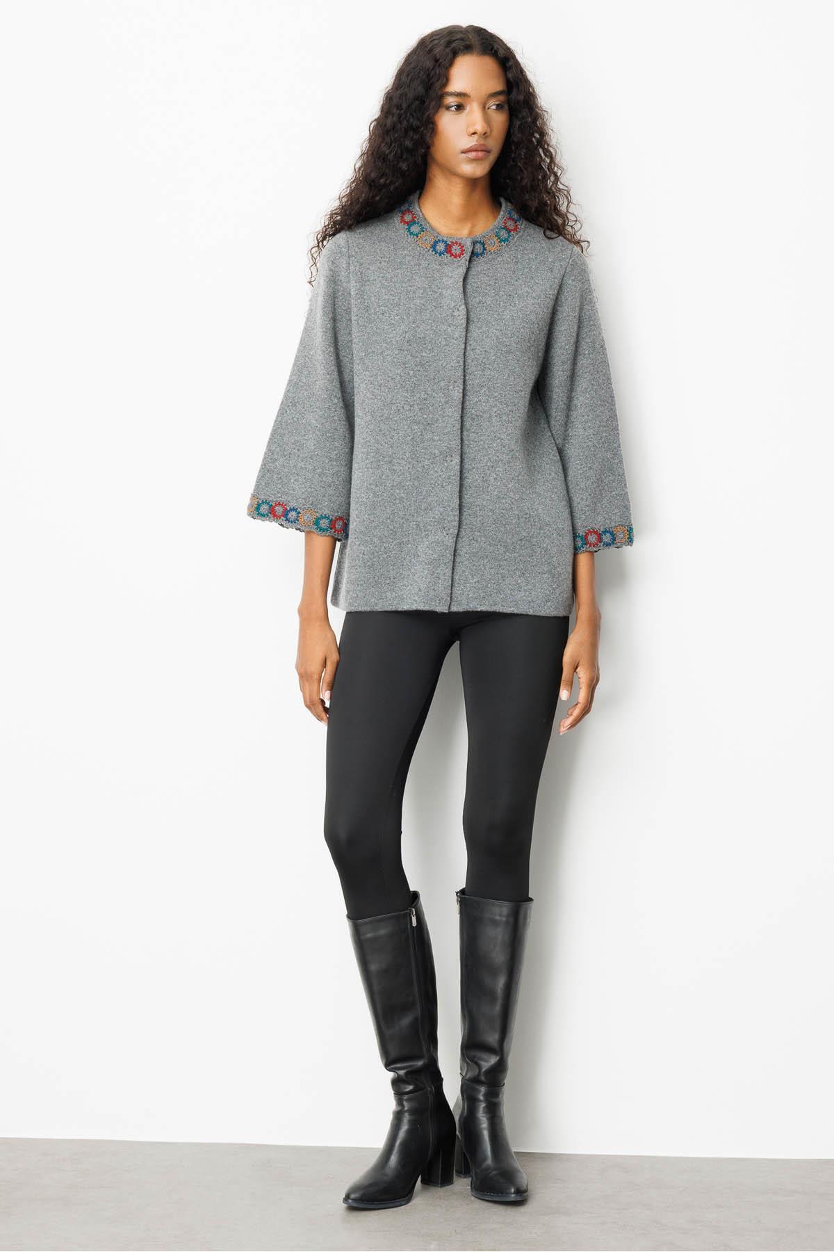 Kadın Yakası ve Kol Ağzı Tığlamalı Kısa Yün Ceket Füme Kadın Yakası ve Kol Ağzı Tığlamalı Kısa Yün Ceket Füme 25022 XL