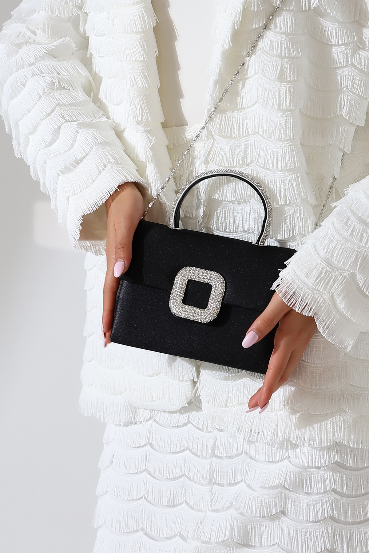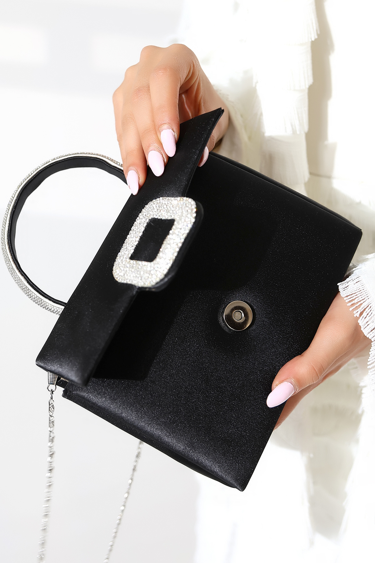 Kadın Simli Kulp Detaylı Zincir Askılı Abiye Çanta Kadın Simli Kulp Detaylı Zincir Askılı Abiye Çanta T8218 تک سایز