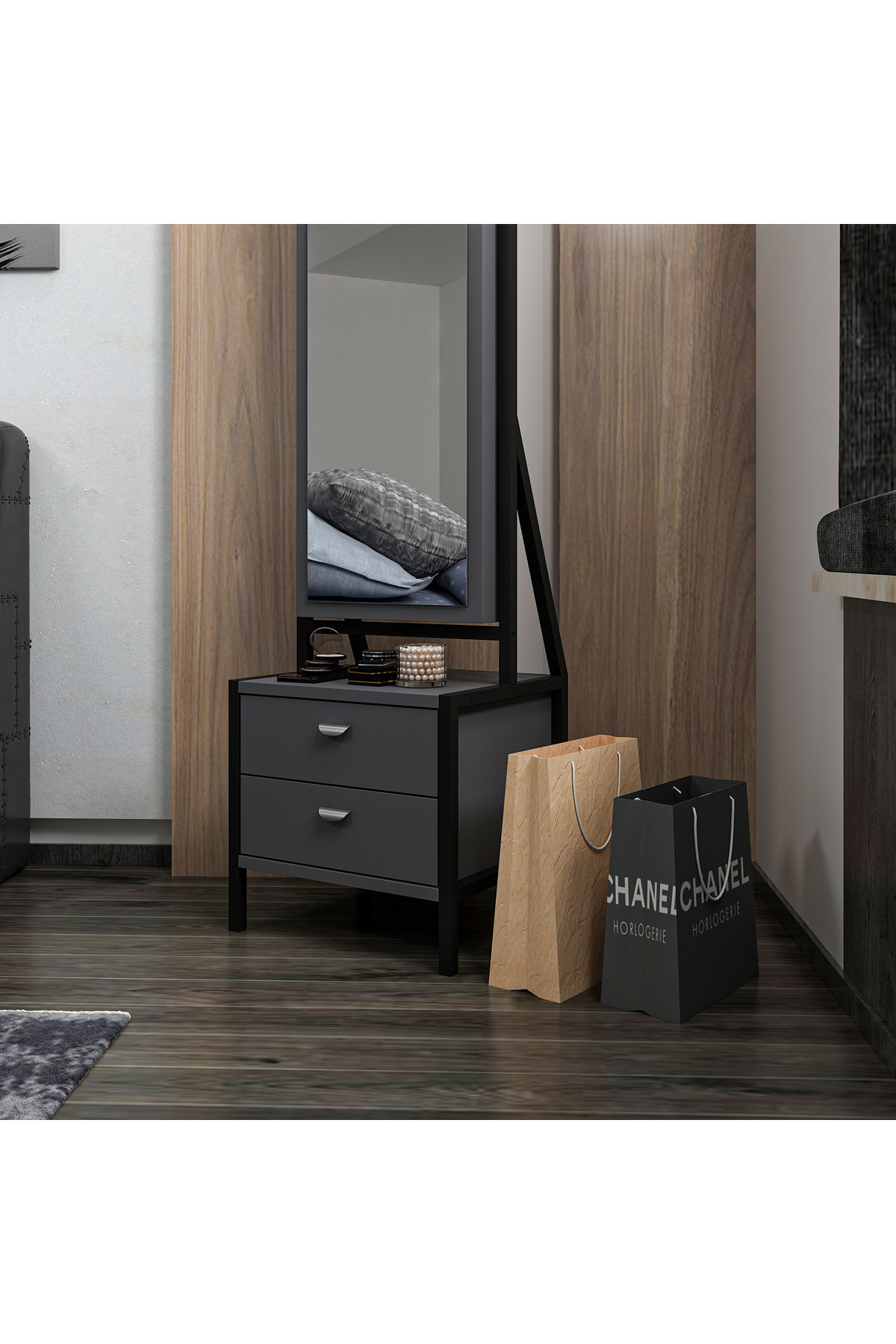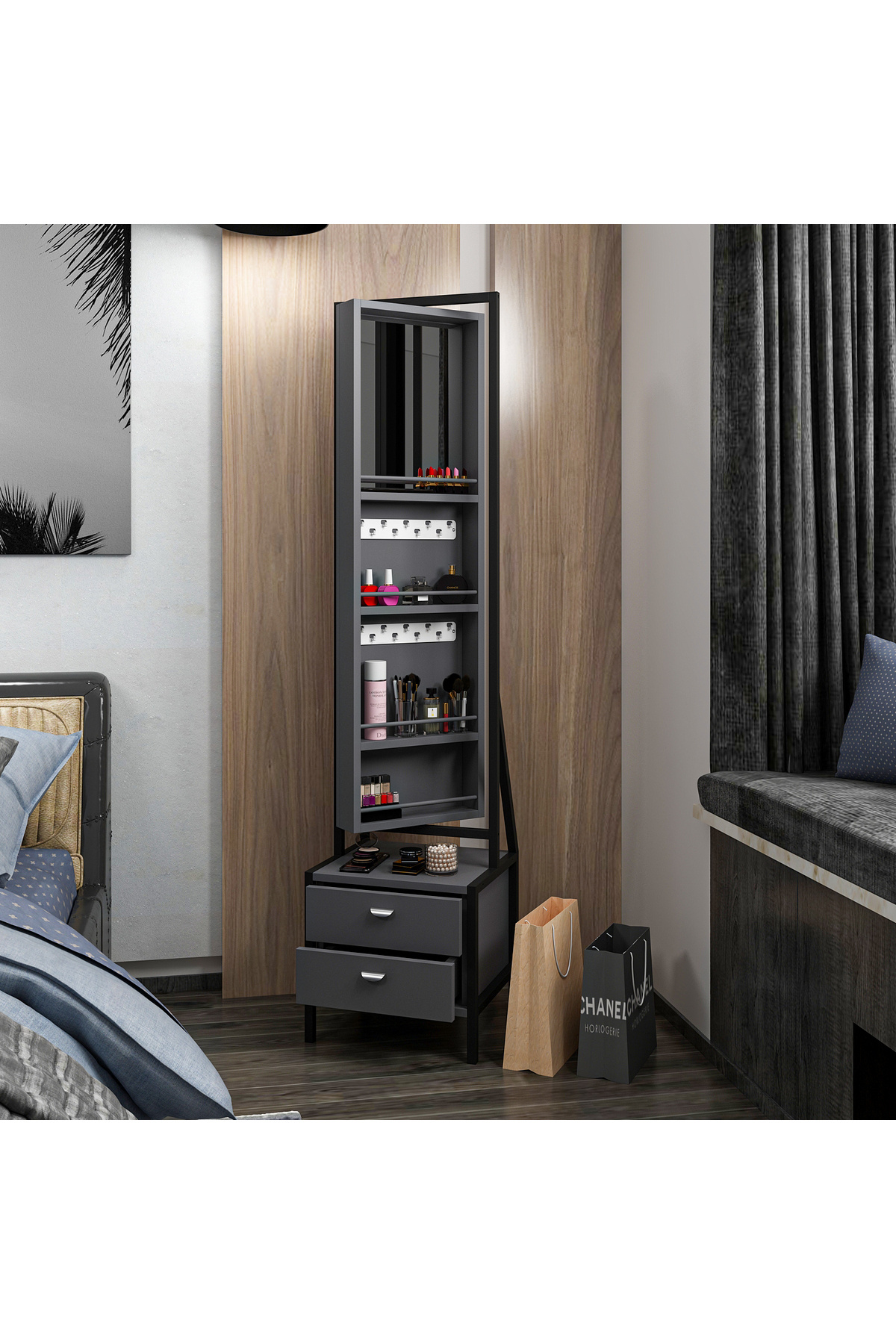 Elegante Aynalı Hareketli Çekmeceli Takı Dolabı - Antrasit/Siyah Elegante Aynalı Hareketli Çekmeceli Takı Dolabı - Antrasit/Siyah M.M.01.06.33.09295 تک سایز