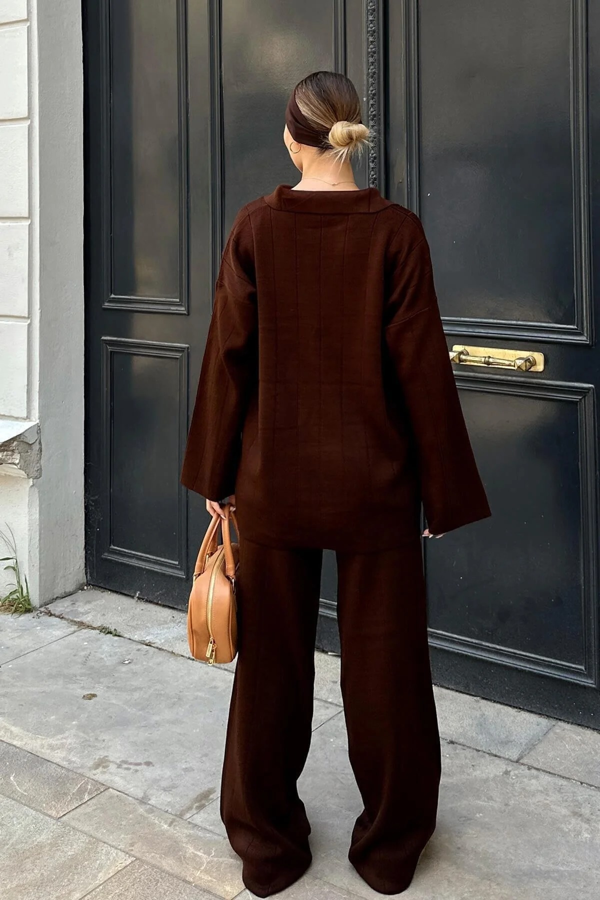Kadın Polo Yaka Fitilli Triko Kazak Pantolon İkili Takım Kadın Polo Yaka Fitilli Triko Kazak Pantolon İkili Takım MRBTKMT Standart