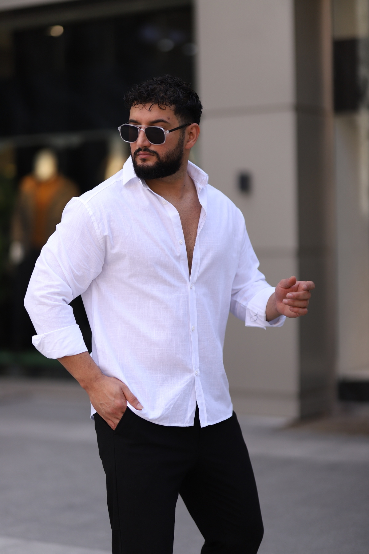 Flam Keten Dokulu Uzun Kollu Beyaz Renk Yarım Oversize Erkek Gömlek Flam Keten Dokulu Uzun Kollu Beyaz Renk Yarım Oversize Erkek Gömlek BRKFLMGMLK 2XL