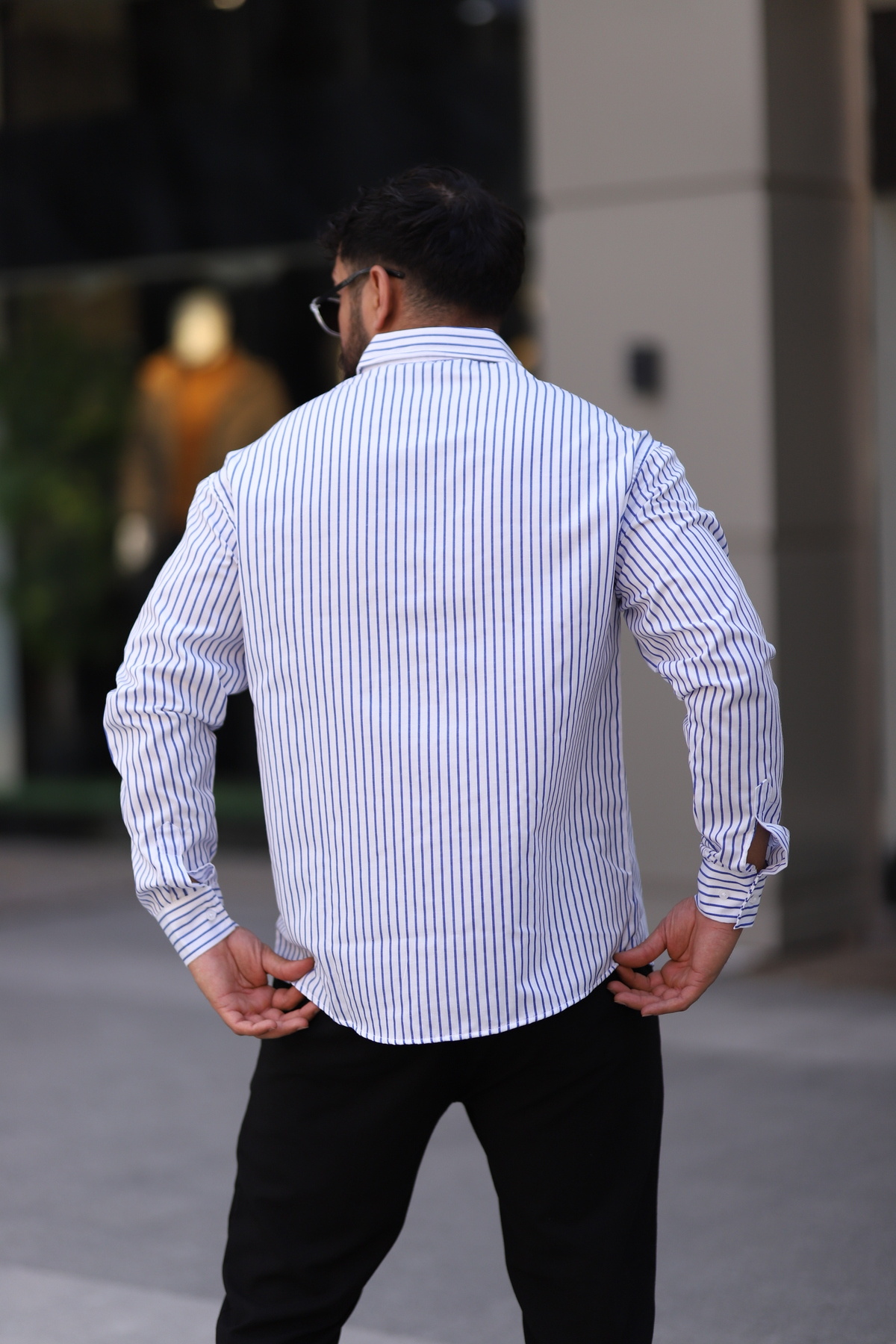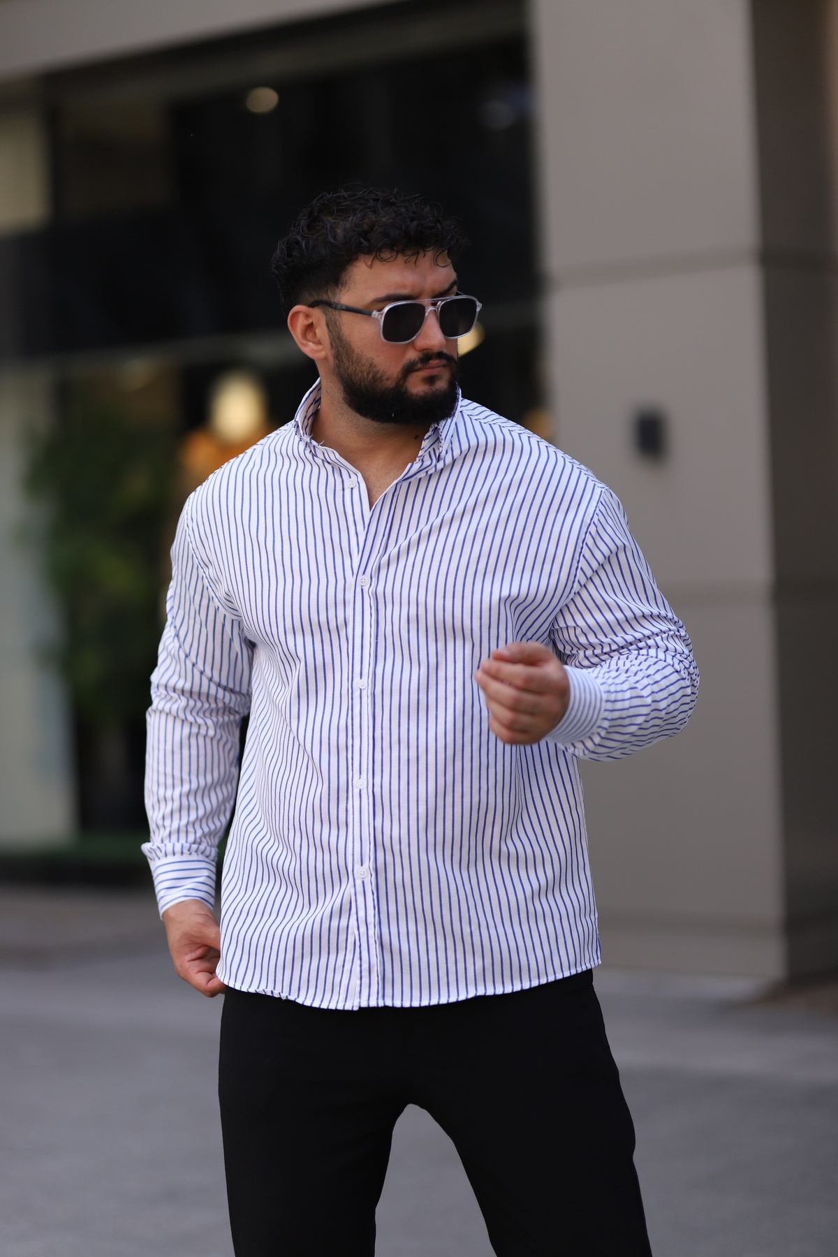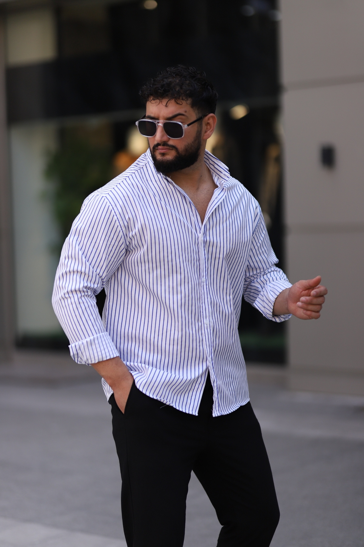 Uzun Kollu Beyaz Renk Mavi Çizgili Yarım Oversize Erkek Gömlek Uzun Kollu Beyaz Renk Mavi Çizgili Yarım Oversize Erkek Gömlek BRKÇZGGMLK 2XL