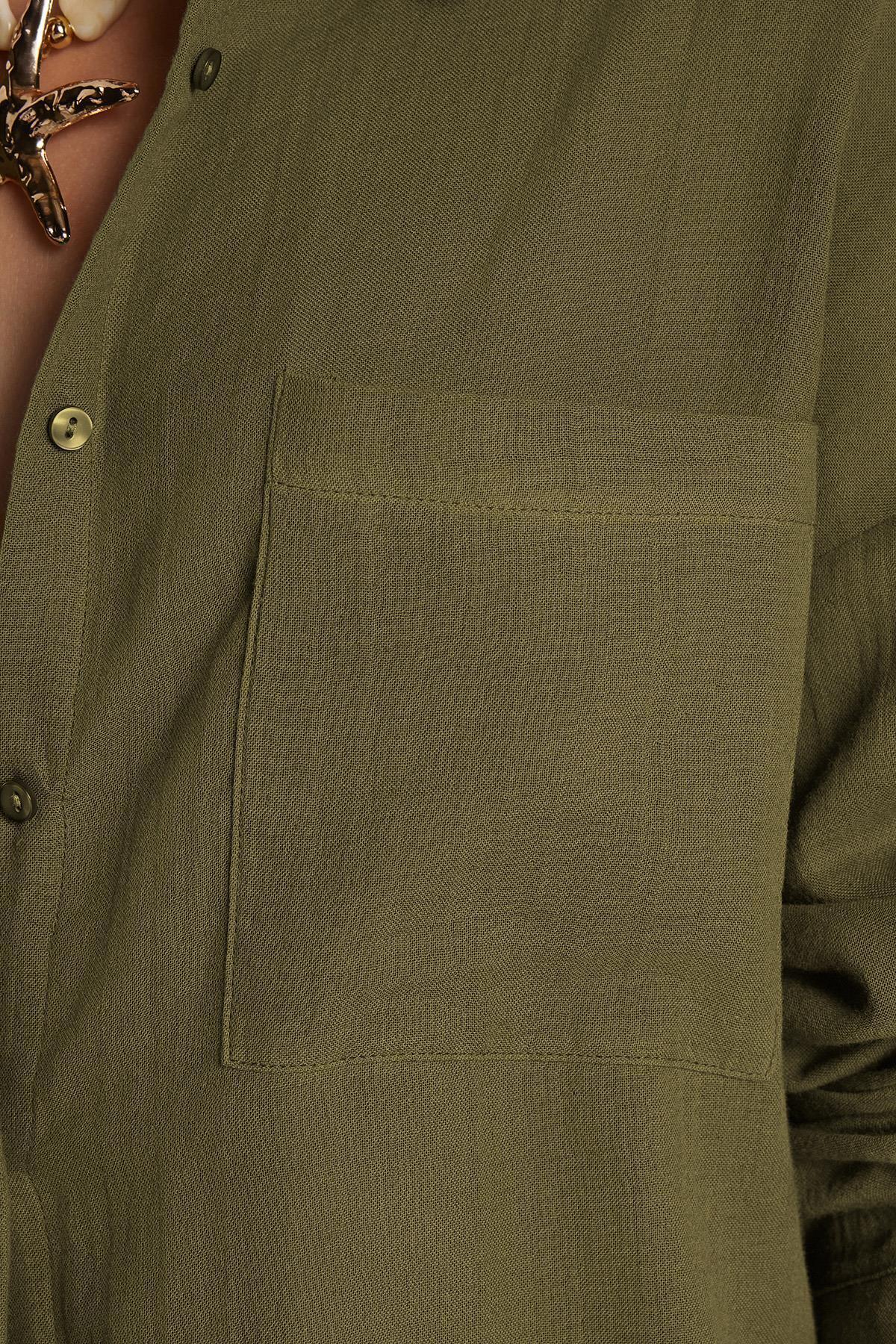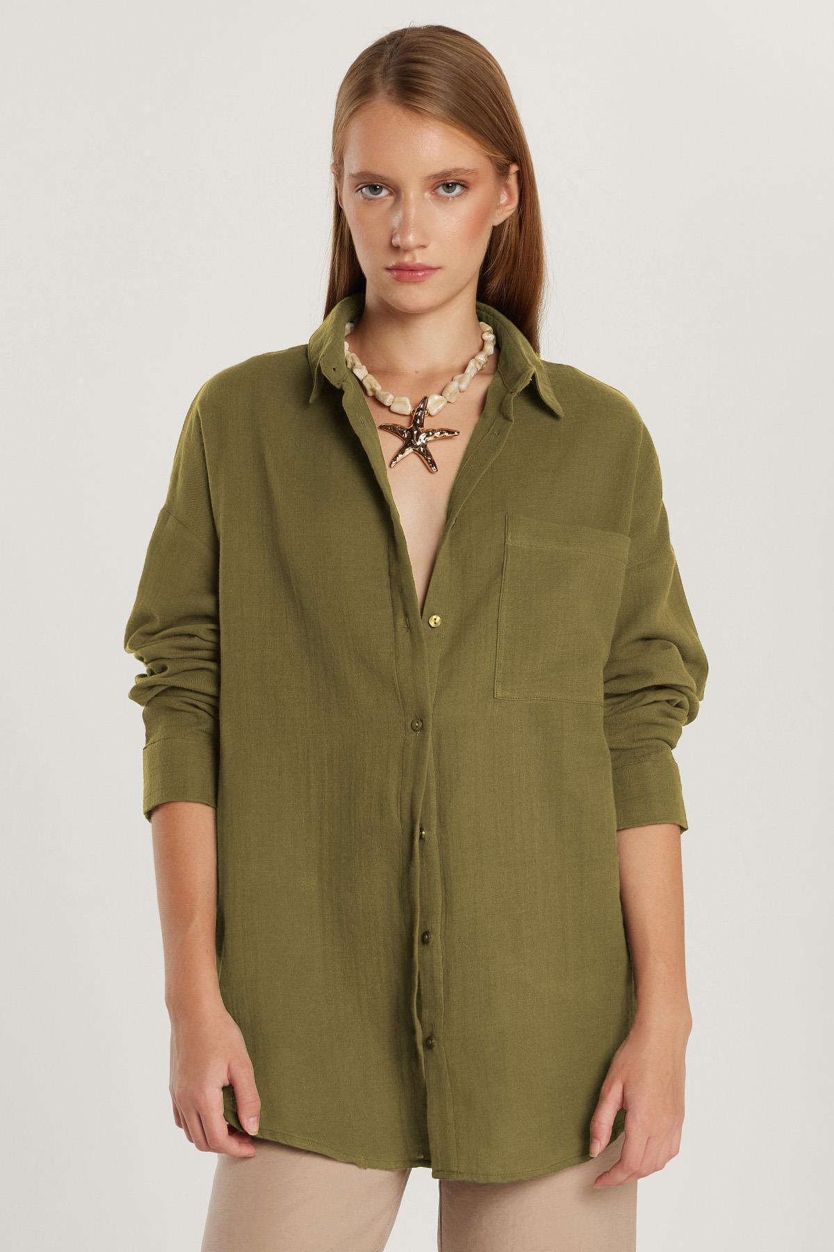 Kadın Oversize Geniş Kesim %100 Pamuk Müslin Kumaş Uzun Kollu Cepli Dokulu Haki Gömlek Kadın Oversize Geniş Kesim %100 Pamuk Müslin Kumaş Uzun Kollu Cepli Dokulu Haki Gömlek BYGM2551 2XL