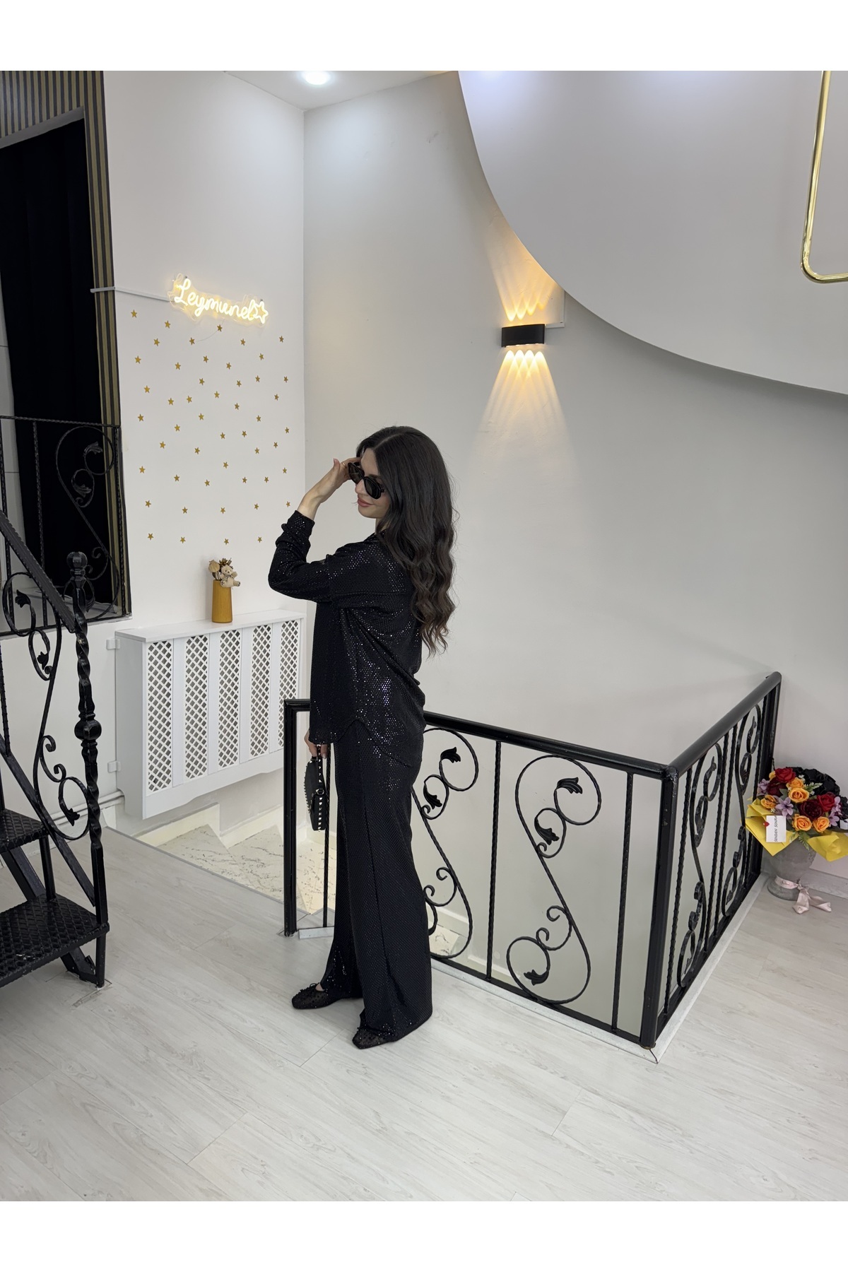 Siyah payetli kumaş çıtçıtlı gömlek beli lastikli payetli pantolon ikili takım Siyah payetli kumaş çıtçıtlı gömlek beli lastikli payetli pantolon ikili takım LLB888890 L