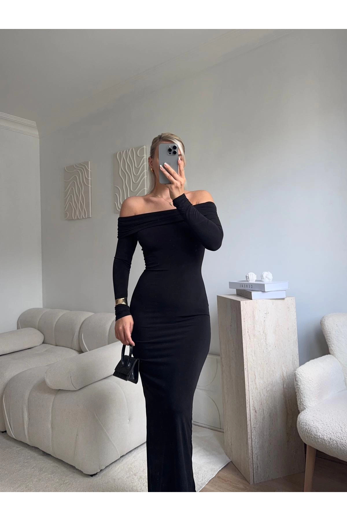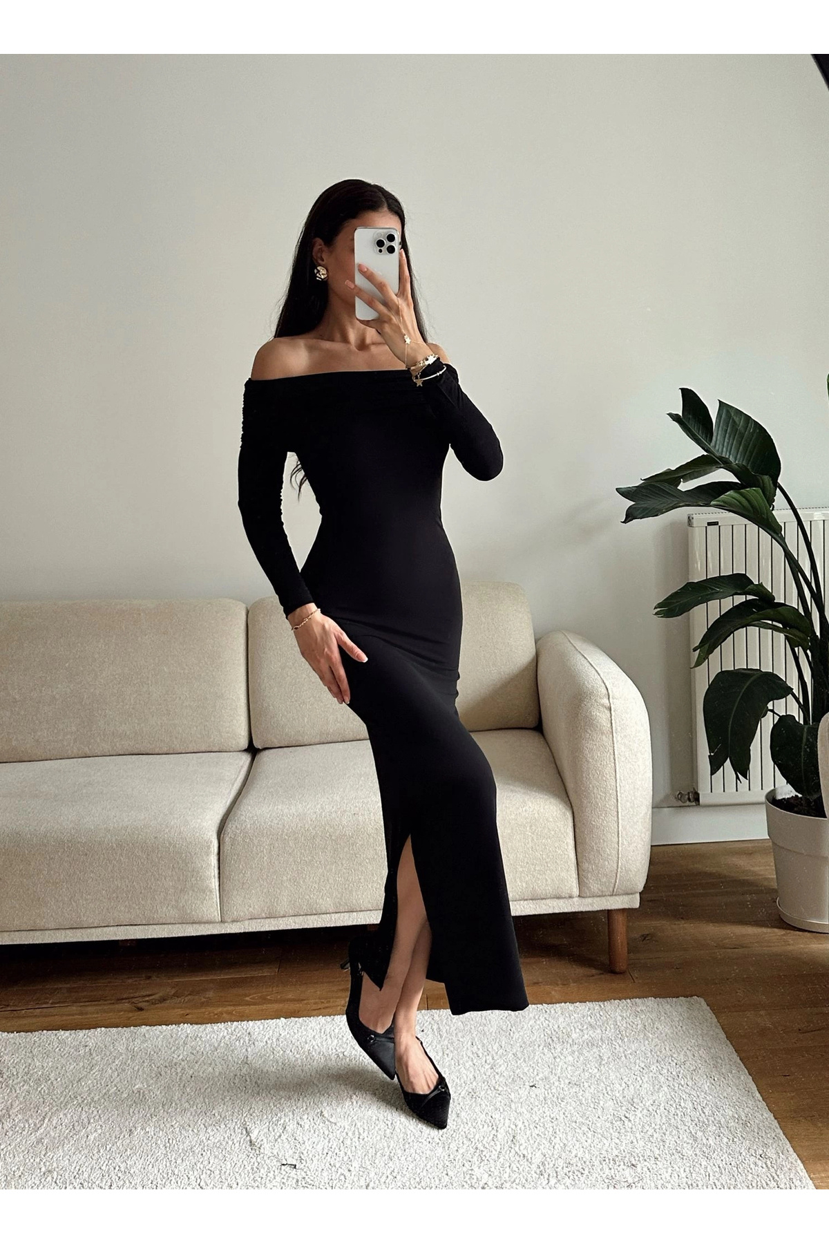 Madonna Yaka Yırtmaçlı Long Elbise - SİYAH Madonna Yaka Yırtmaçlı Long Elbise - SİYAH P18381S1479 L