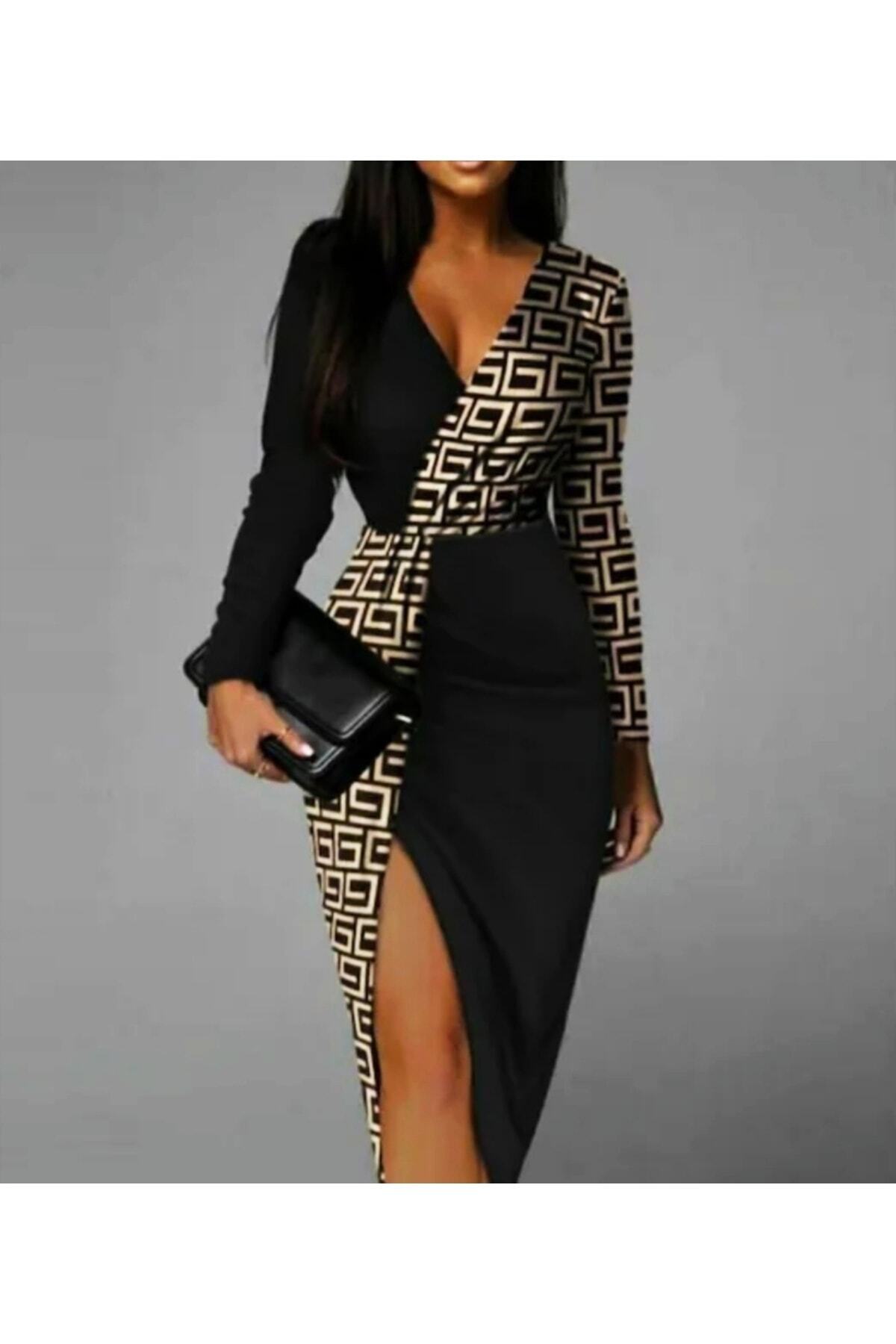 V Yaka Kazayağı Desenli Şardonlu Dalgıç Elbise - Siyah V Yaka Kazayağı Desenli Şardonlu Dalgıç Elbise - Siyah JS61324 2XL-3XL