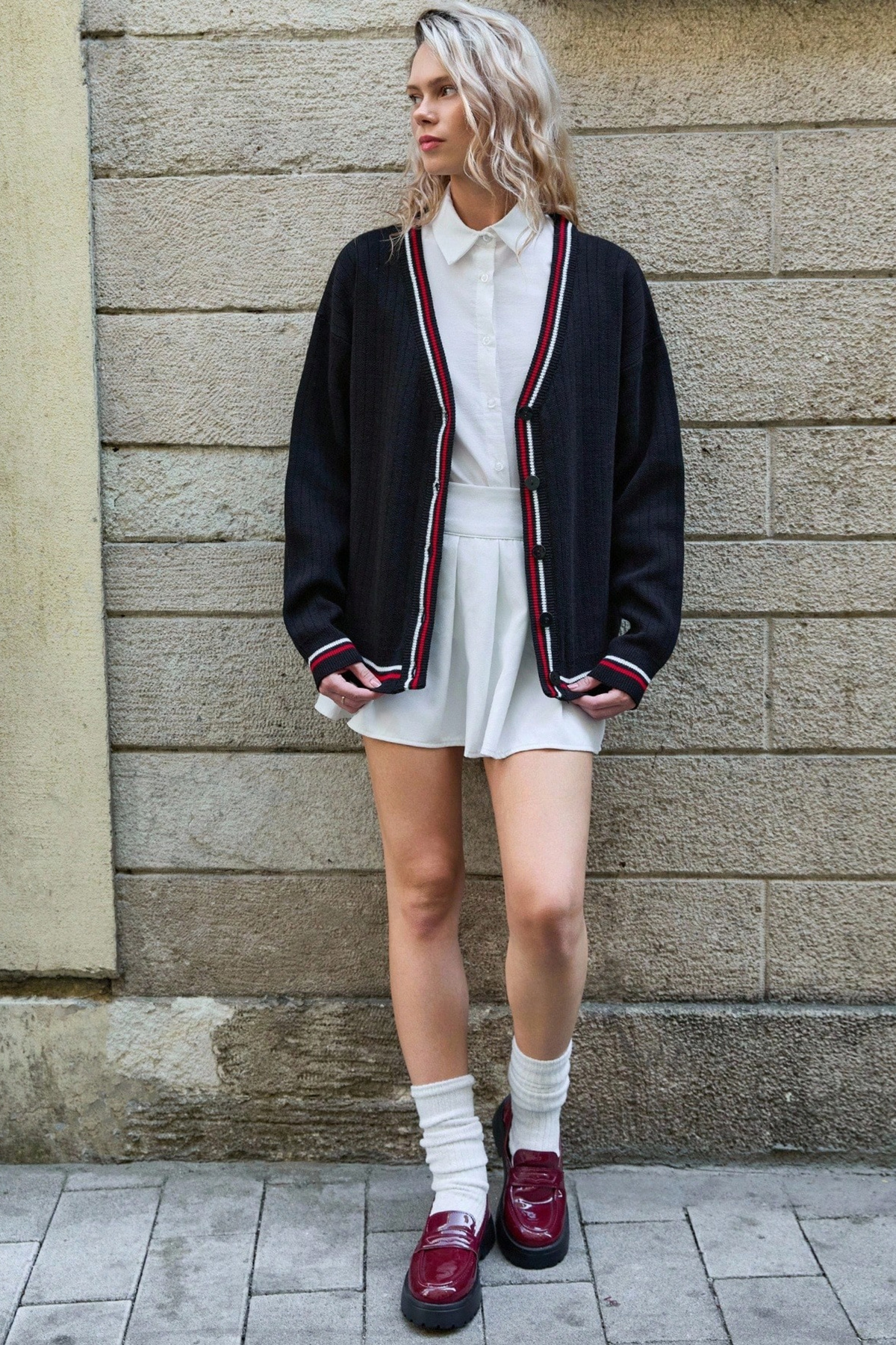 Kadın Kırmızı Beyaz Şerit Detaylı Siyah Hırka Kadın Kırmızı Beyaz Şerit Detaylı Siyah Hırka 8996557 تک سایز