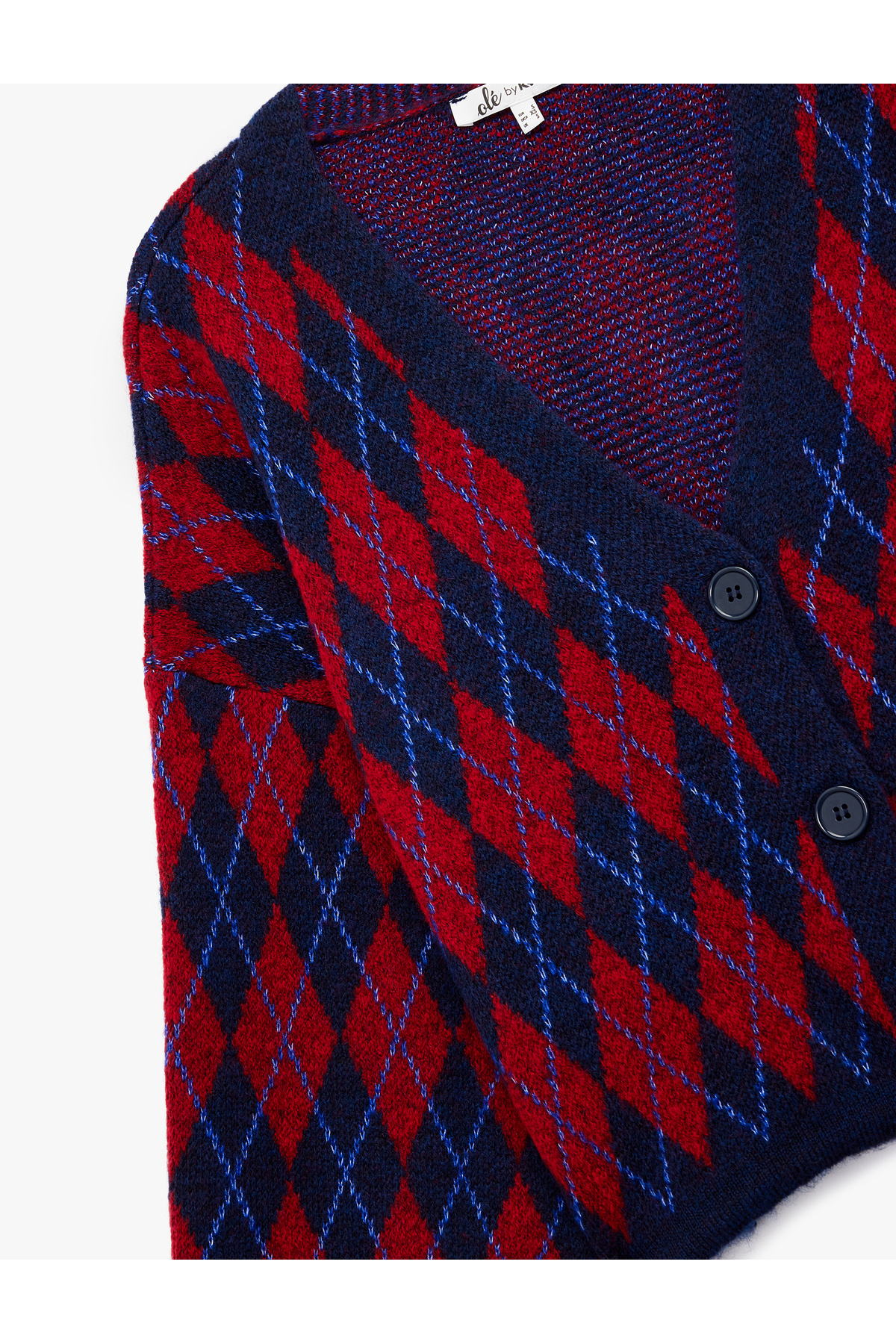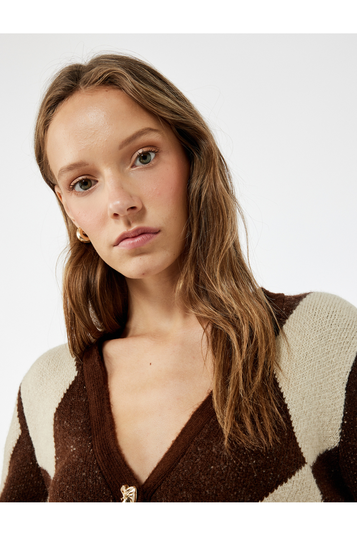 Düğmeli V Yaka Bağcık Detaylı Geometrik Desenli Uzun Kollu Triko Hırka Düğmeli V Yaka Bağcık Detaylı Geometrik Desenli Uzun Kollu Triko Hırka 6WAL90022IT L