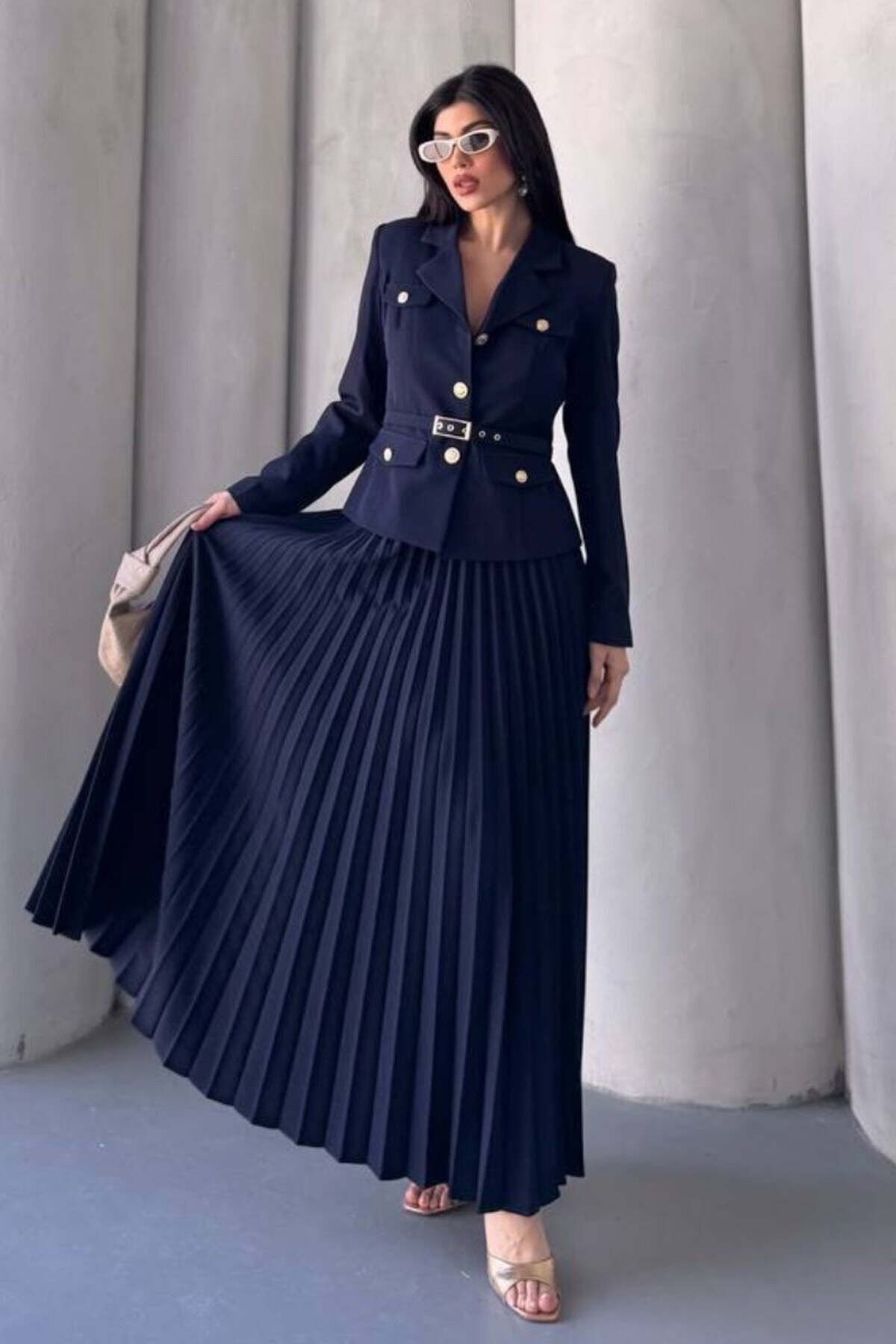 Kadın İkili Alt Üst Takım Şık Kemerli Cep ve Düğme Detaylı Kısa Blazer Ceket Piliseli Uzun Etek Takı Kadın İkili Alt Üst Takım Şık Kemerli Cep ve Düğme Detaylı Kısa Blazer Ceket Piliseli Uzun Etek Takı PRA-13125861-013701 42