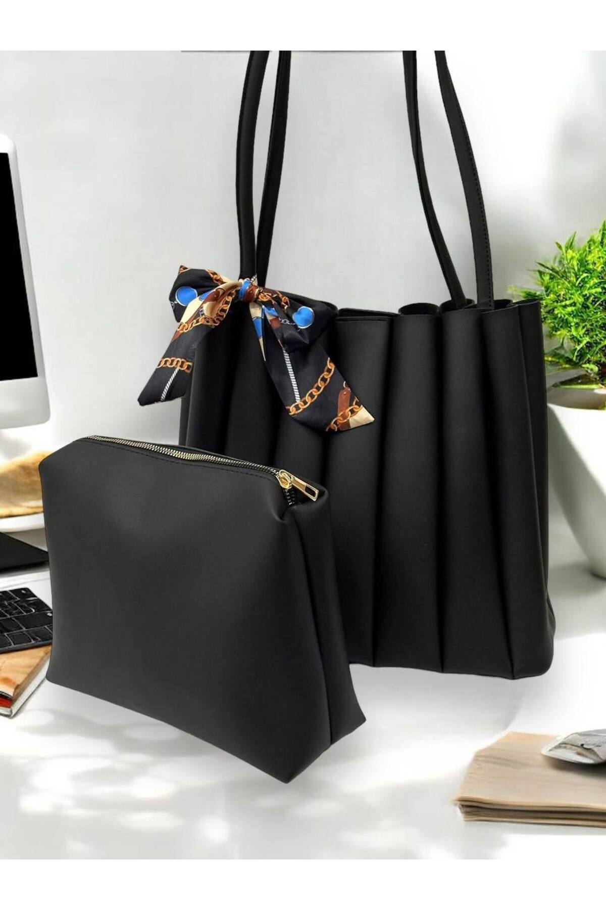 Kadın Siyah büyük kol çantası Fular hediyeli Kadın Siyah büyük kol çantası Fular hediyeli a3706 Standart