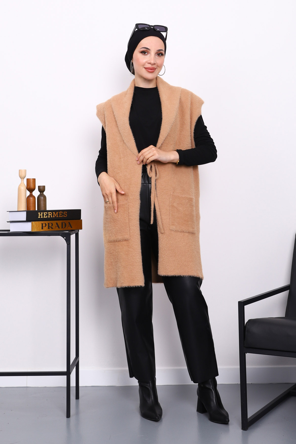 Bisküvi Cepli Uzun Angora Yumoş Yelek Bisküvi Cepli Uzun Angora Yumoş Yelek IMJ007483 تک سایز