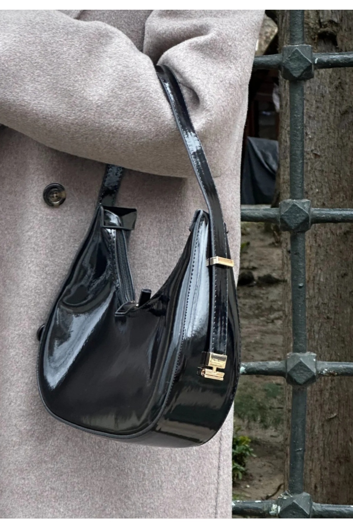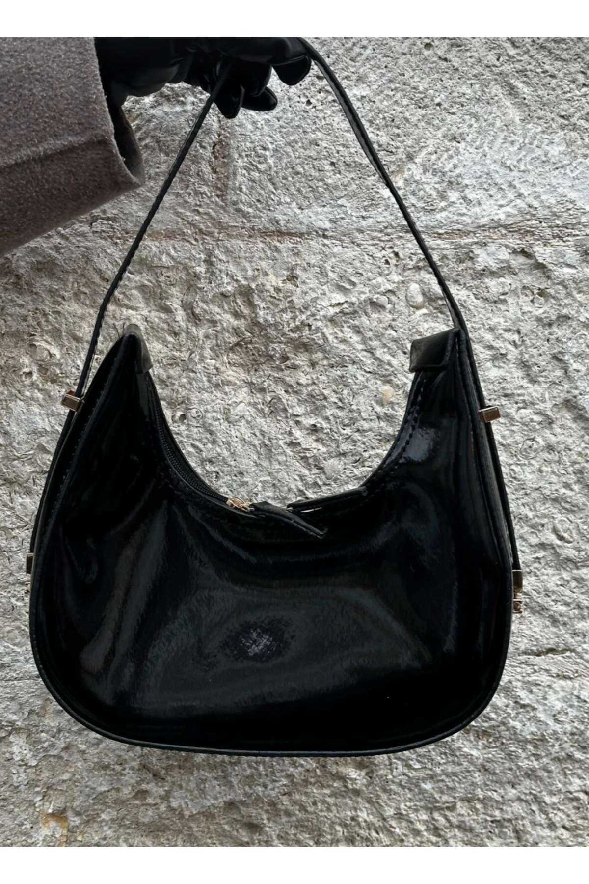 Kadın Rugan Deri Baget Fermuar Kapamalı Askı Detaylı Kol Çantası Süet Lacivert - Rugan Siyah - Beyaz Kadın Rugan Deri Baget Fermuar Kapamalı Askı Detaylı Kol Çantası Süet Lacivert - Rugan Siyah - Beyaz Cann15 Standart
