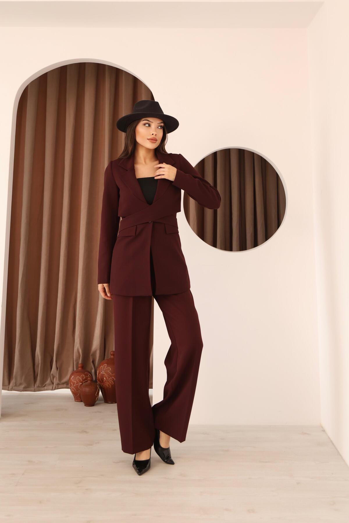 Kadın Bordo Önden Çapraz Kuşaklı Blazer Ceket Pantolon Takım Kadın Bordo Önden Çapraz Kuşaklı Blazer Ceket Pantolon Takım HZL4075 40
