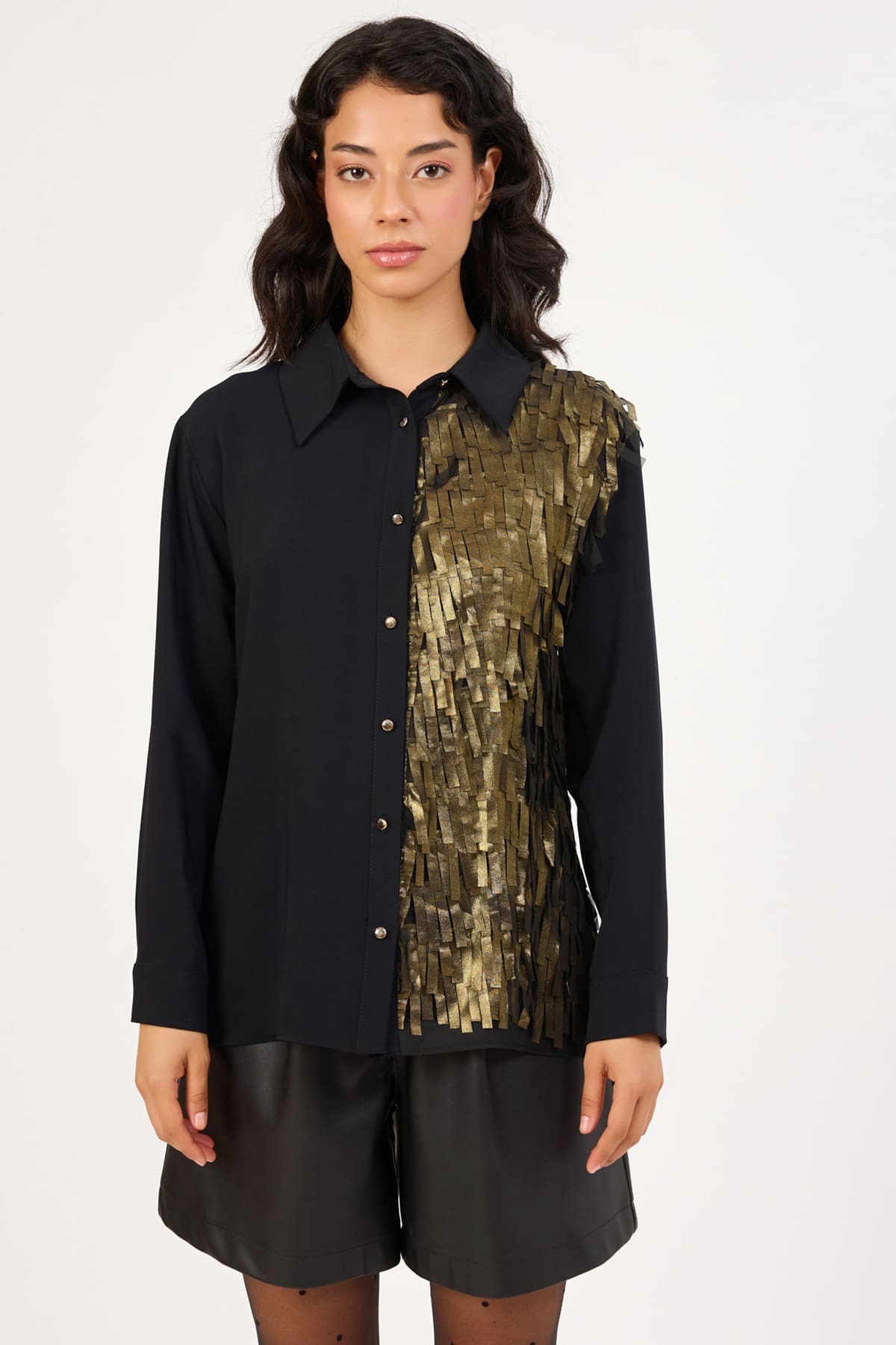 Katlama detaylı balon kol siyah gömlek Katlama detaylı balon kol siyah gömlek 352117020 2