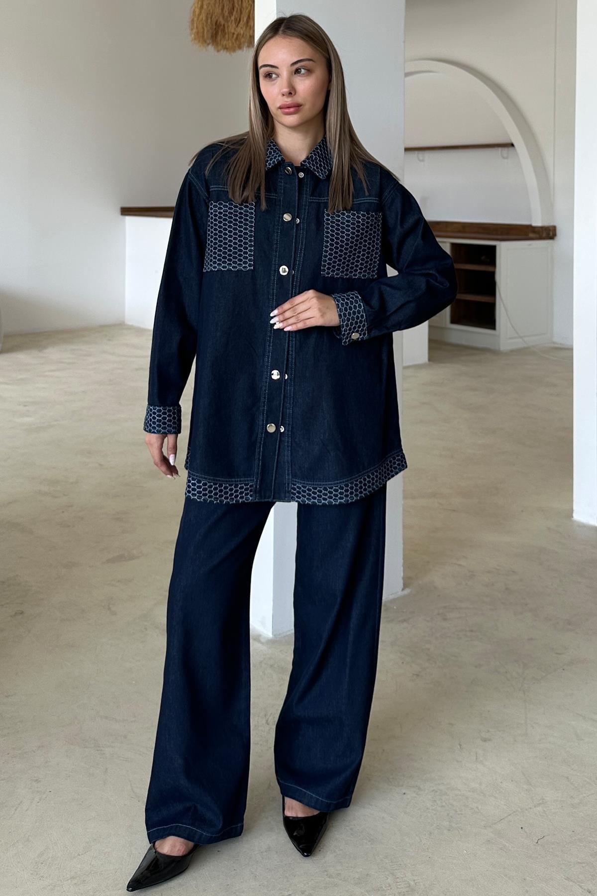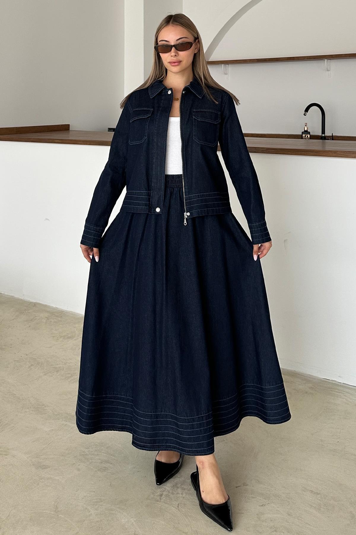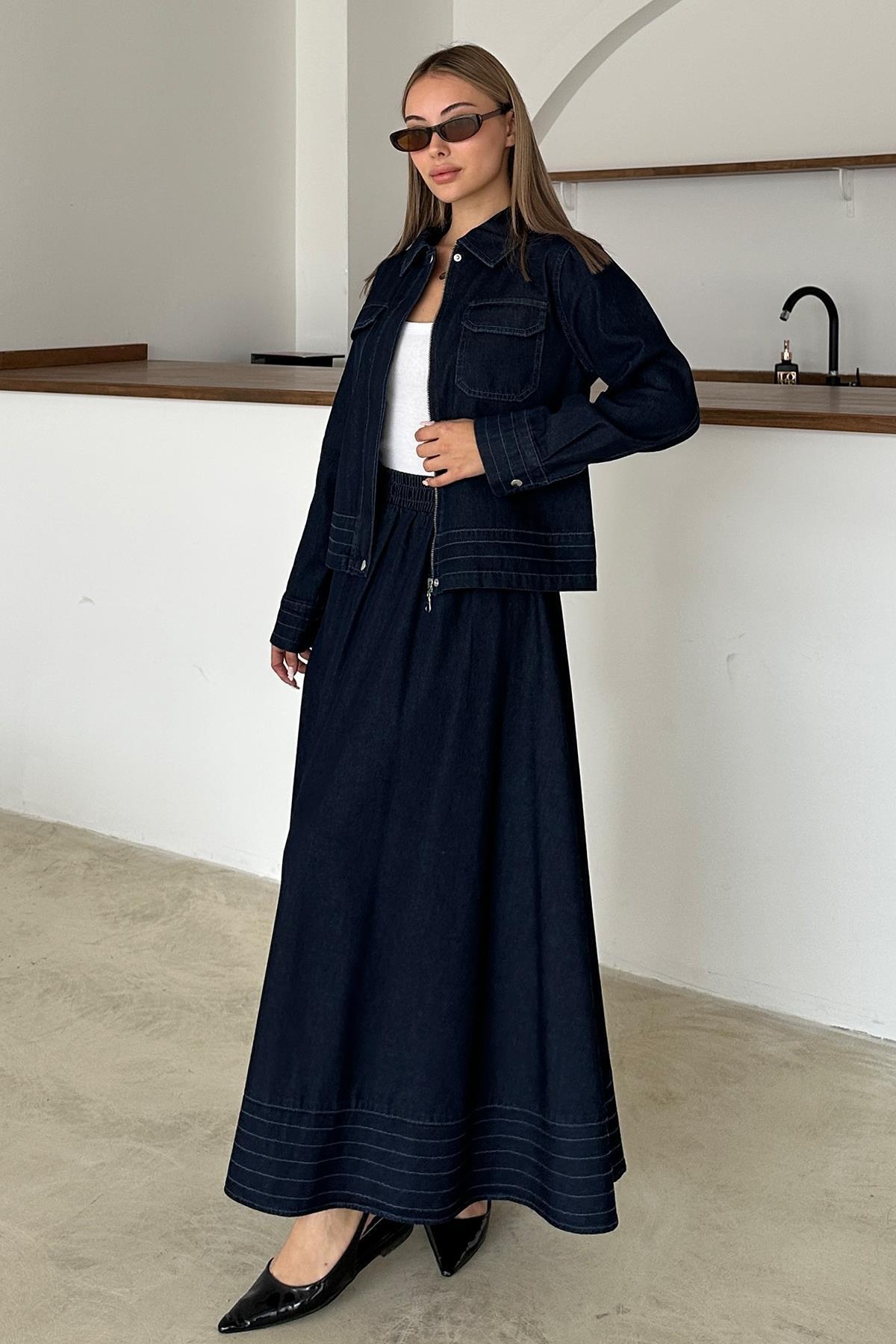 Fermuar Kapamalı Dikiş Detaylı Ceket Etek Denim Takım KOYU MAVİ 9380-TK Fermuar Kapamalı Dikiş Detaylı Ceket Etek Denim Takım KOYU MAVİ 9380-TK L