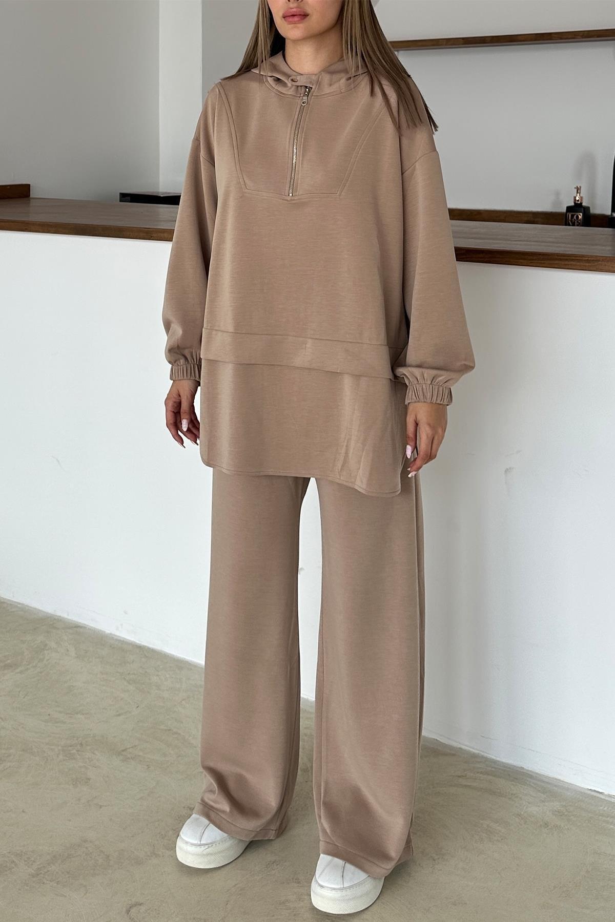 Kapüşonlu Fermuar Detaylı Premium Kumaş Sweat Pantolon Takım KAMEL 9373-TK Kapüşonlu Fermuar Detaylı Premium Kumaş Sweat Pantolon Takım KAMEL 9373-TK L