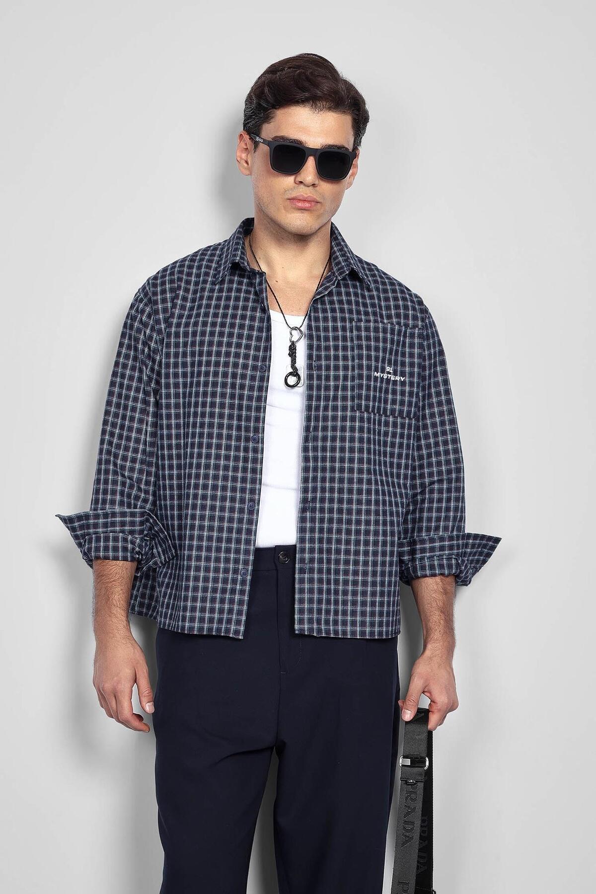 Erkek Boxy Fit Oversize Ekose Uzun Kollu Gömlek Lacivert Erkek Boxy Fit Oversize Ekose Uzun Kollu Gömlek Lacivert GML.0177 XL