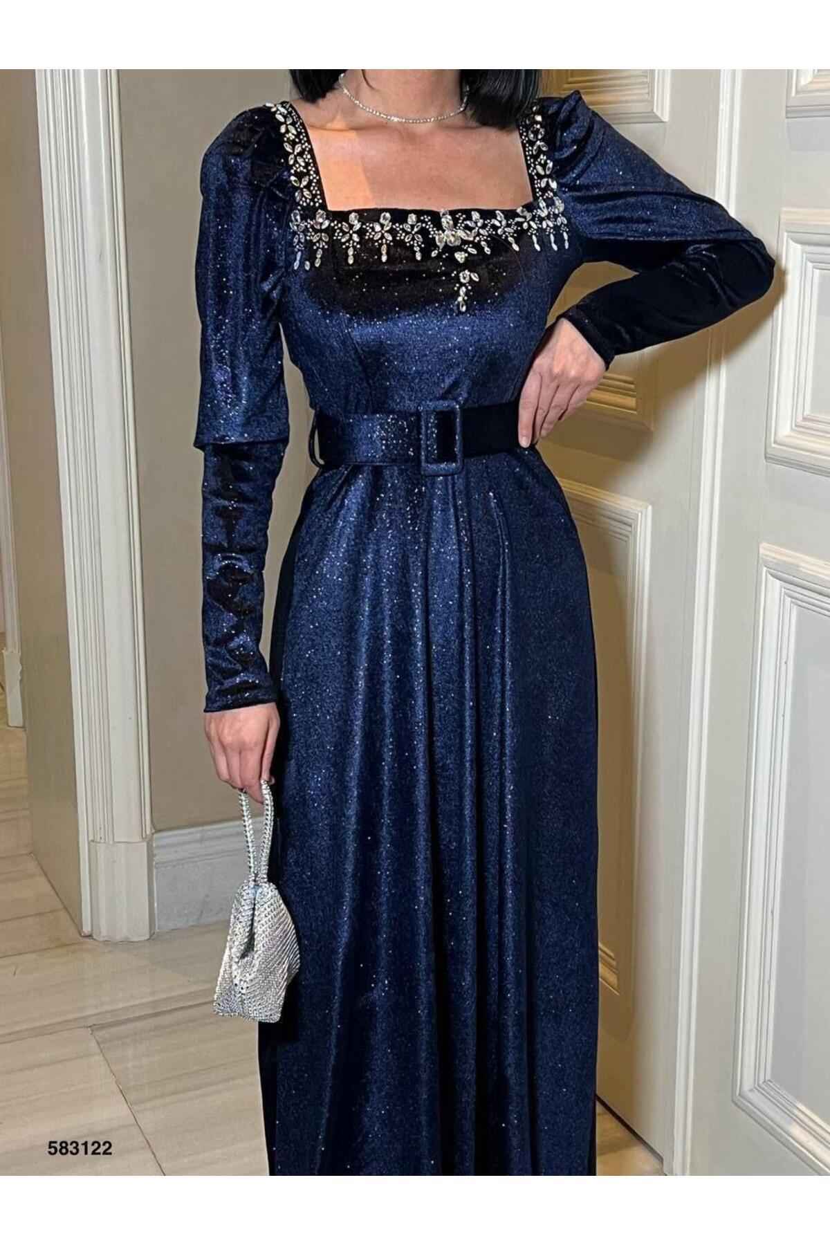 ESNEK SİMLİ KADİFE KARE YAKA TAŞ VE KEMER DETAYLI ABİYE ELBİSE 583122 LACİVERT ESNEK SİMLİ KADİFE KARE YAKA TAŞ VE KEMER DETAYLI ABİYE ELBİSE 583122 LACİVERT L
