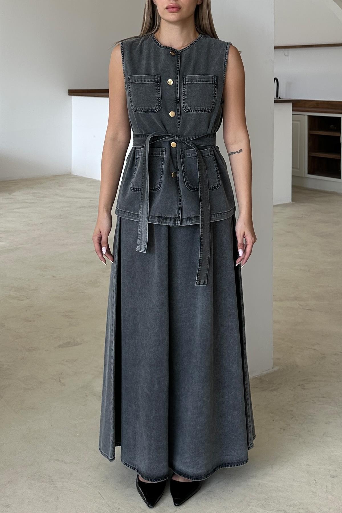 Cep Detaylı Yelek Etek Denim Takım ANTRASİT 9377-TK Cep Detaylı Yelek Etek Denim Takım ANTRASİT 9377-TK L