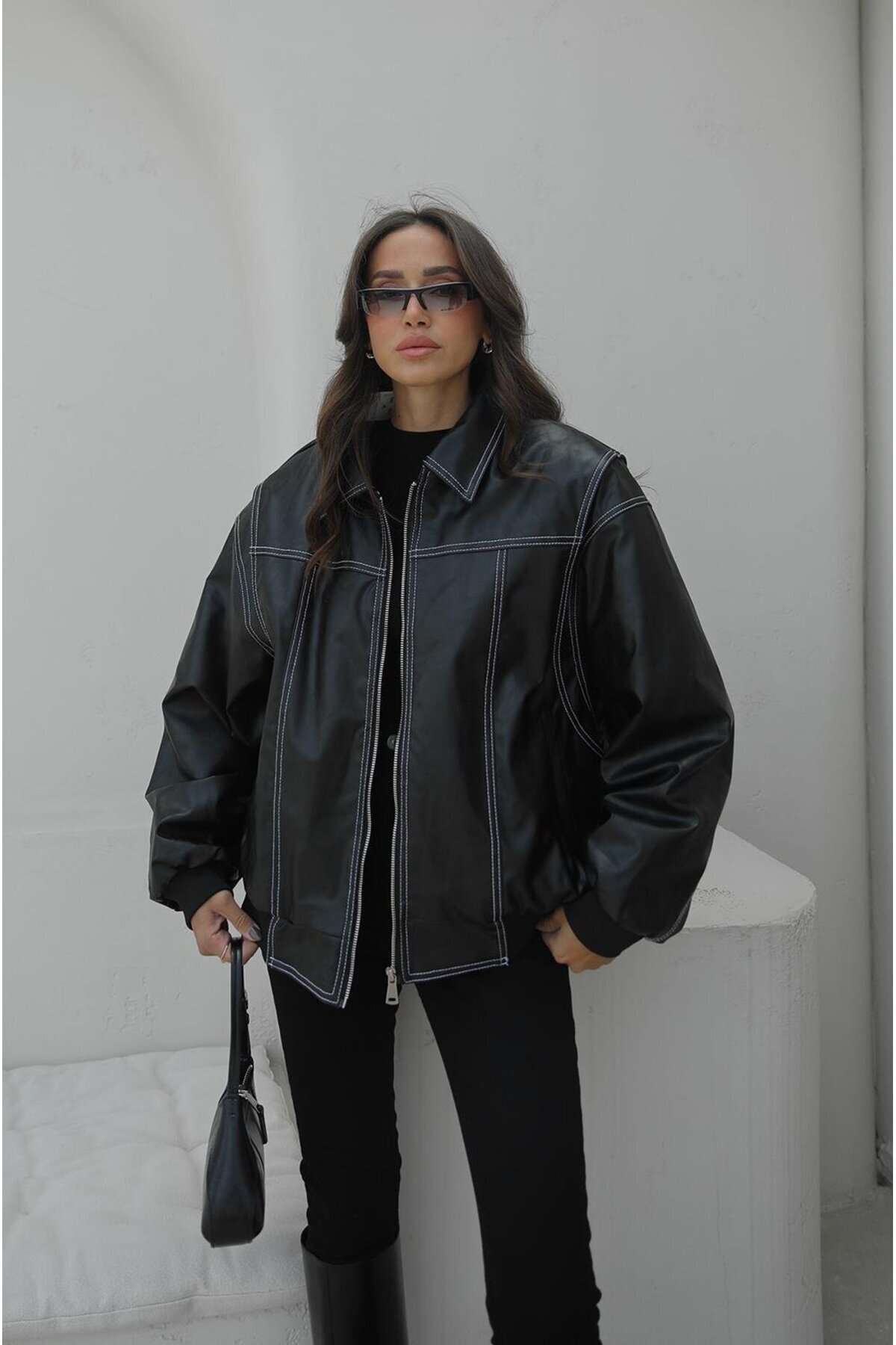 Siyah Dikiş Detaylı Astarlı Deri Ceket Siyah Dikiş Detaylı Astarlı Deri Ceket Hcek628 L