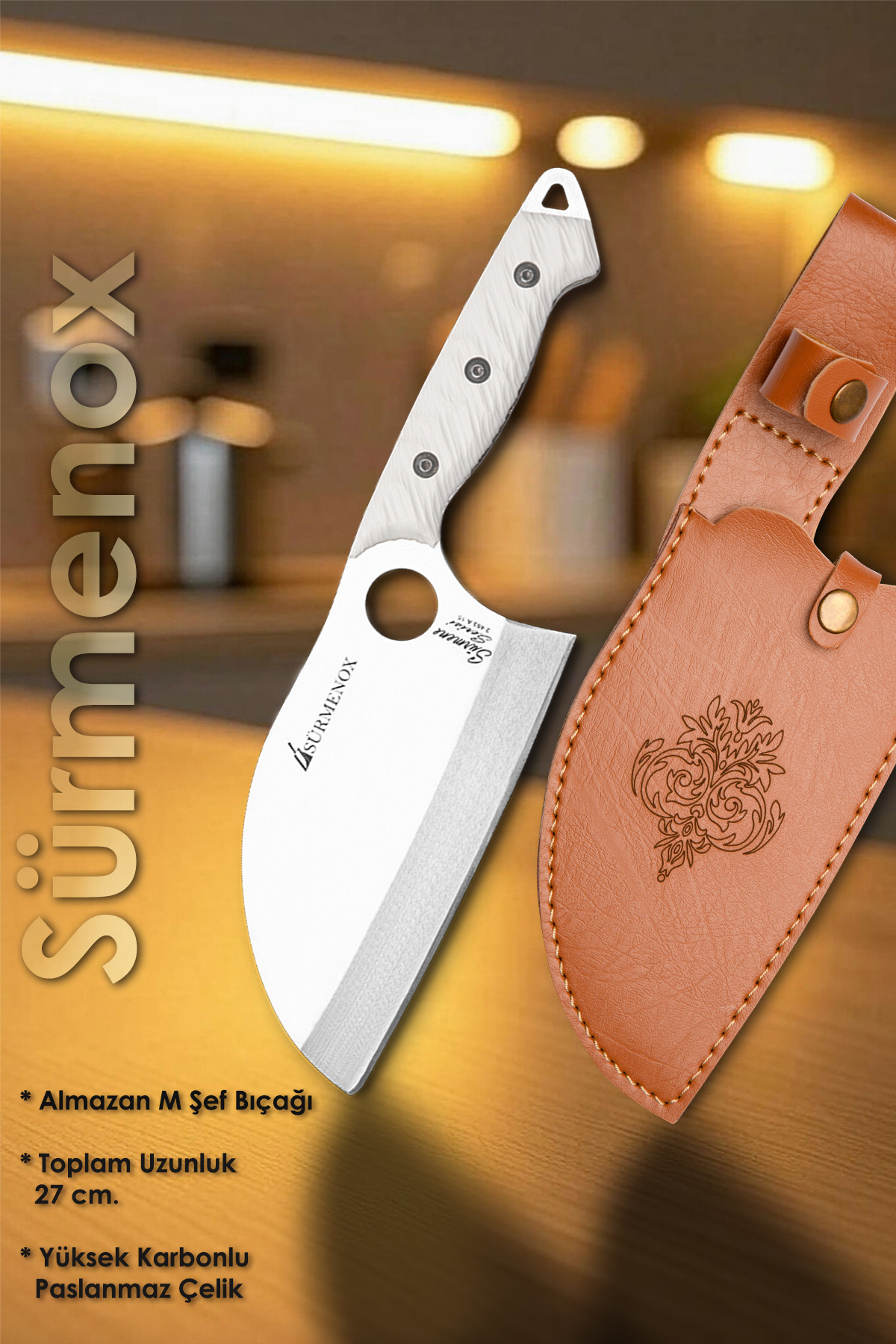 Sürmene Serisi K Almazan Mutfak Şef Bıçağı Bıçak Kamp Bıçağı Deri Kılıflı Beyaz Verzalit Sap HDS-150 Sürmene Serisi K Almazan Mutfak Şef Bıçağı Bıçak Kamp Bıçağı Deri Kılıflı Beyaz Verzalit Sap HDS-150 تک سایز