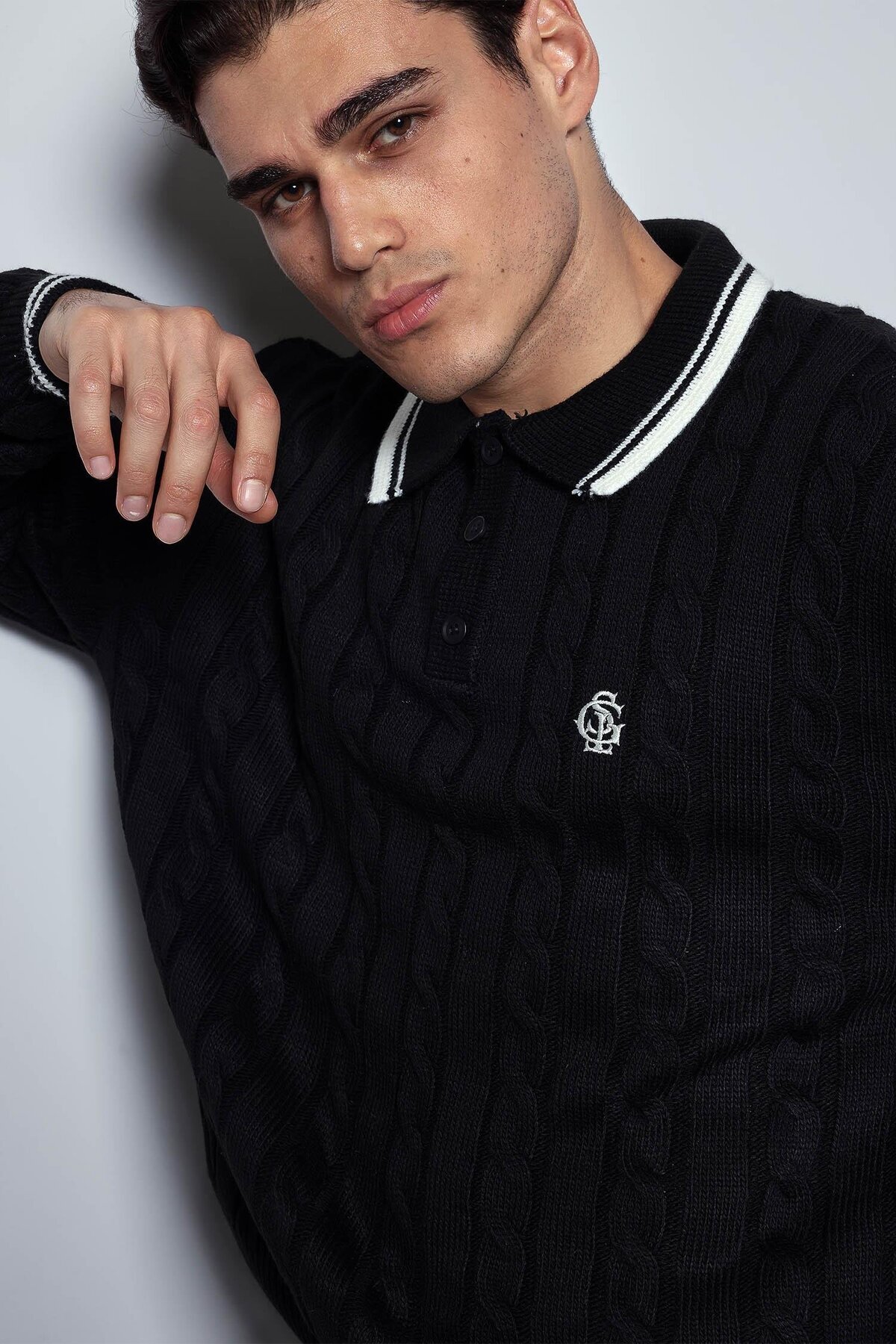 Erkek Oversize Polo Yaka Örgü Desenli Triko Kazak Siyah Erkek Oversize Polo Yaka Örgü Desenli Triko Kazak Siyah KZK.0089 L