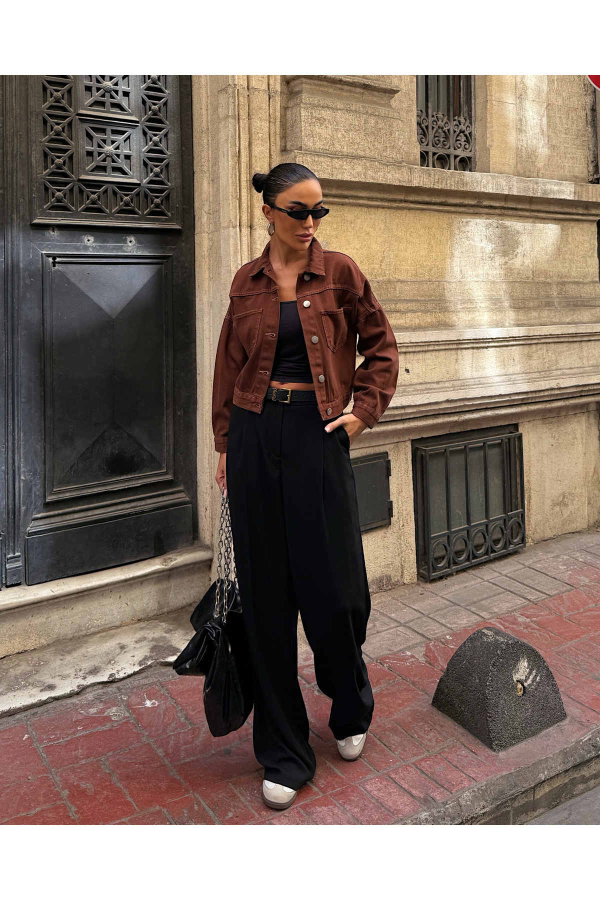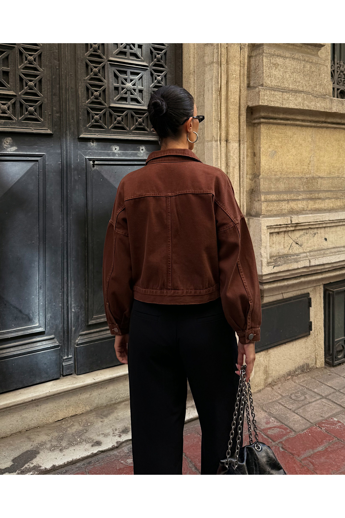 Kadın Düğmeli Çift Cepli Crop Denim Ceket Kahverengi Kadın Düğmeli Çift Cepli Crop Denim Ceket Kahverengi LBY4000 L