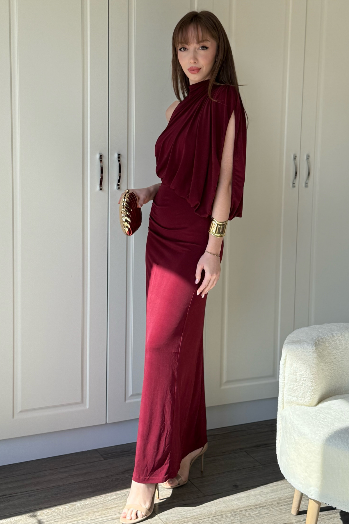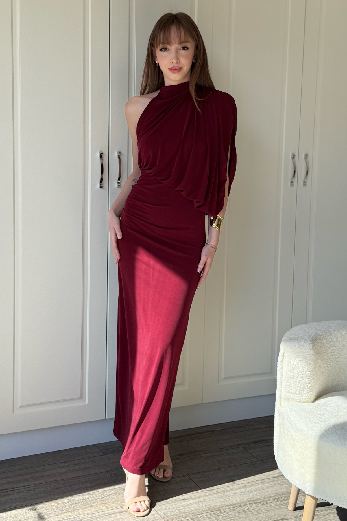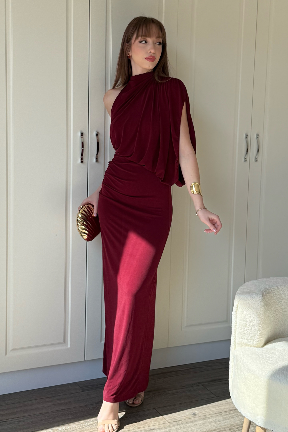 Tek Omuz Boyunlu Zarif Dökümlü Bordo Maxi Elbise Tek Omuz Boyunlu Zarif Dökümlü Bordo Maxi Elbise NovaELBkış6 XL