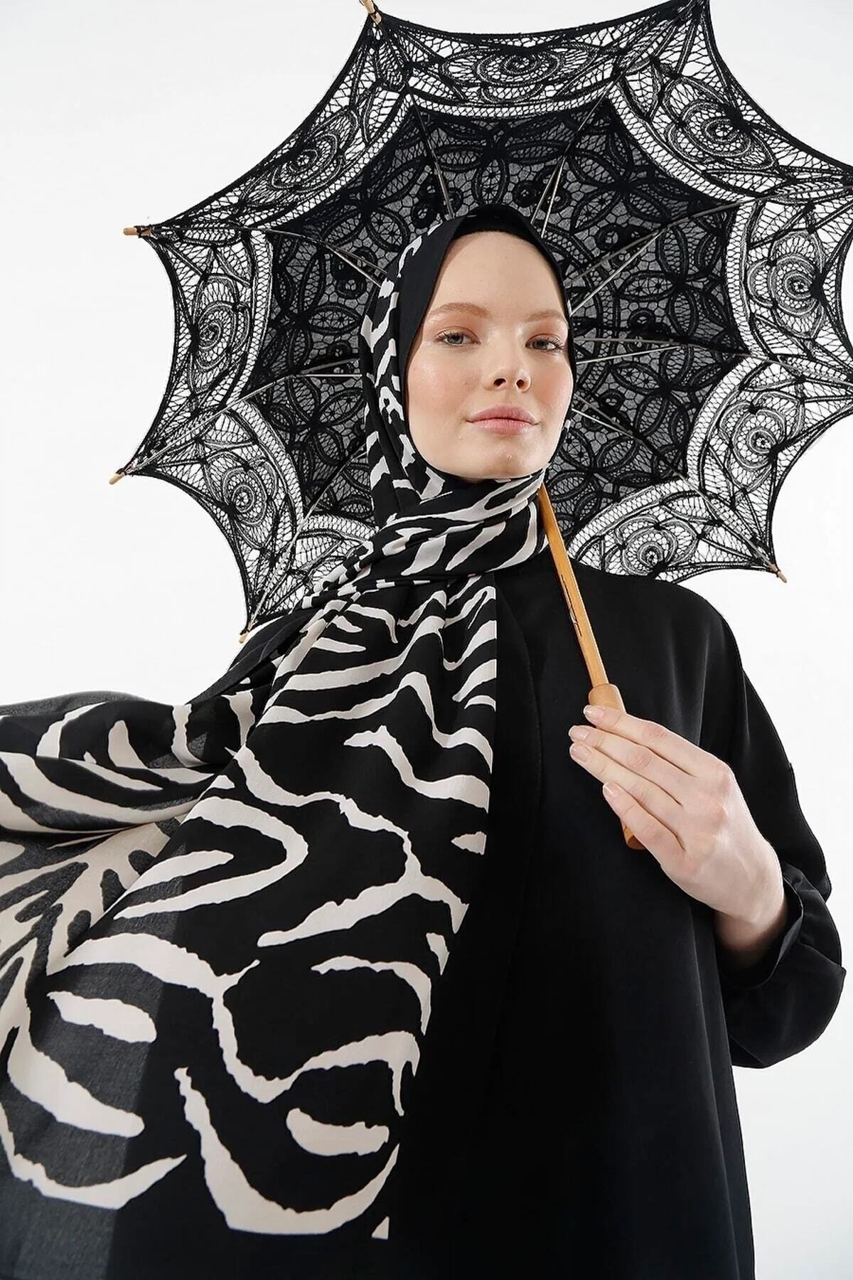 Kadın Medine Ipeği Şal Zebra Desen Siyah - Kırık Beyaz Kadın Medine Ipeği Şal Zebra Desen Siyah - Kırık Beyaz M-02-160 190 x 80