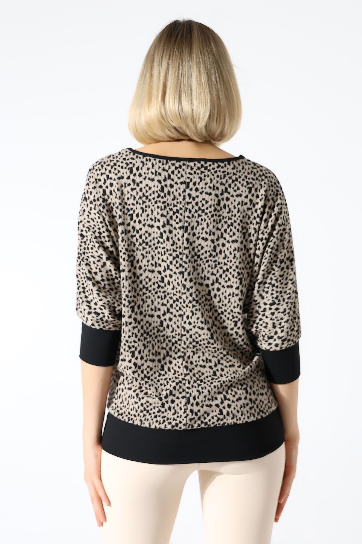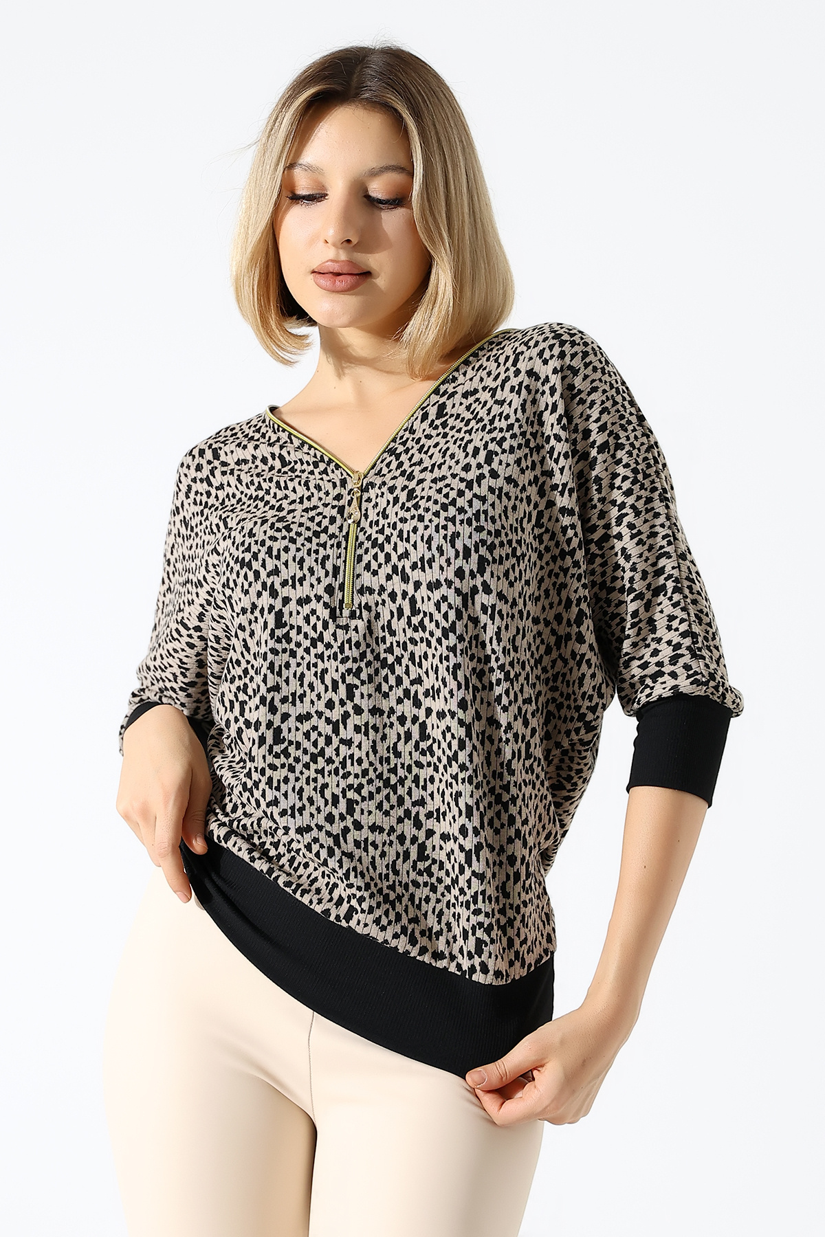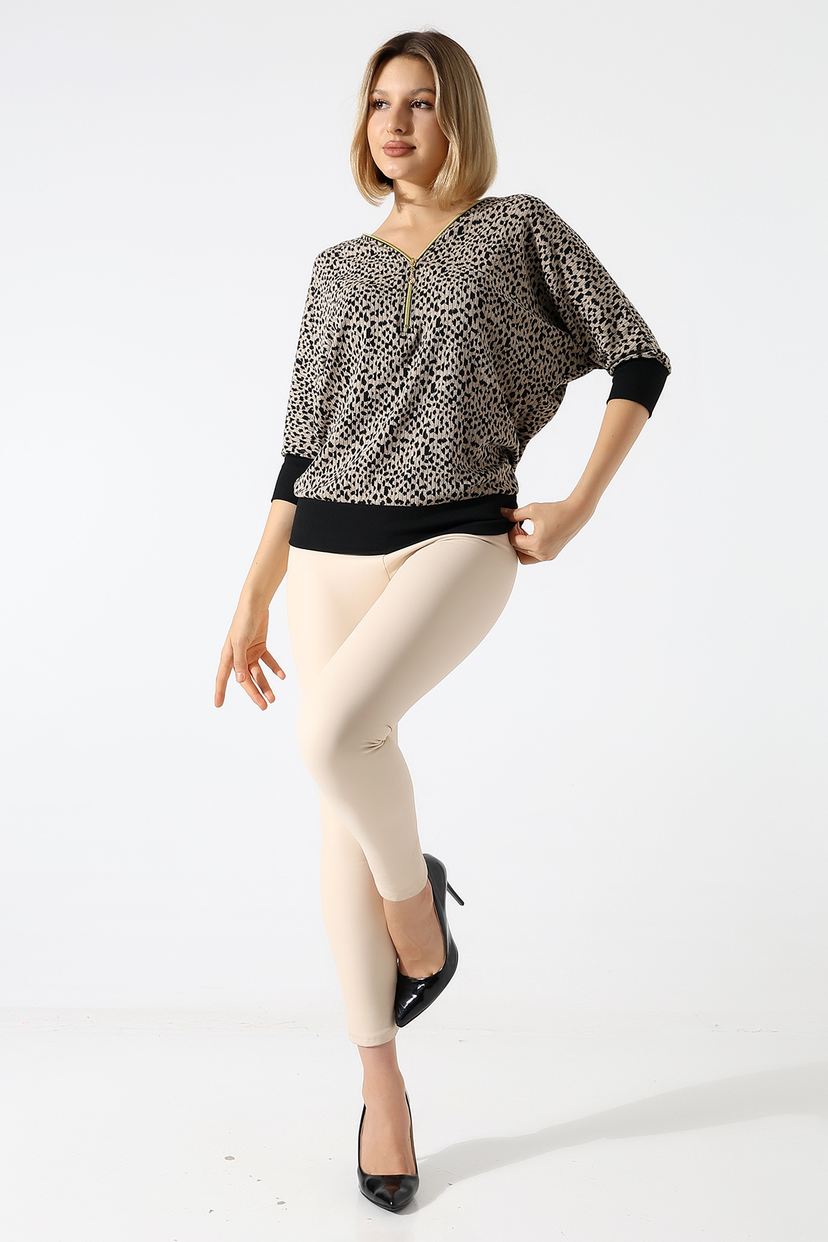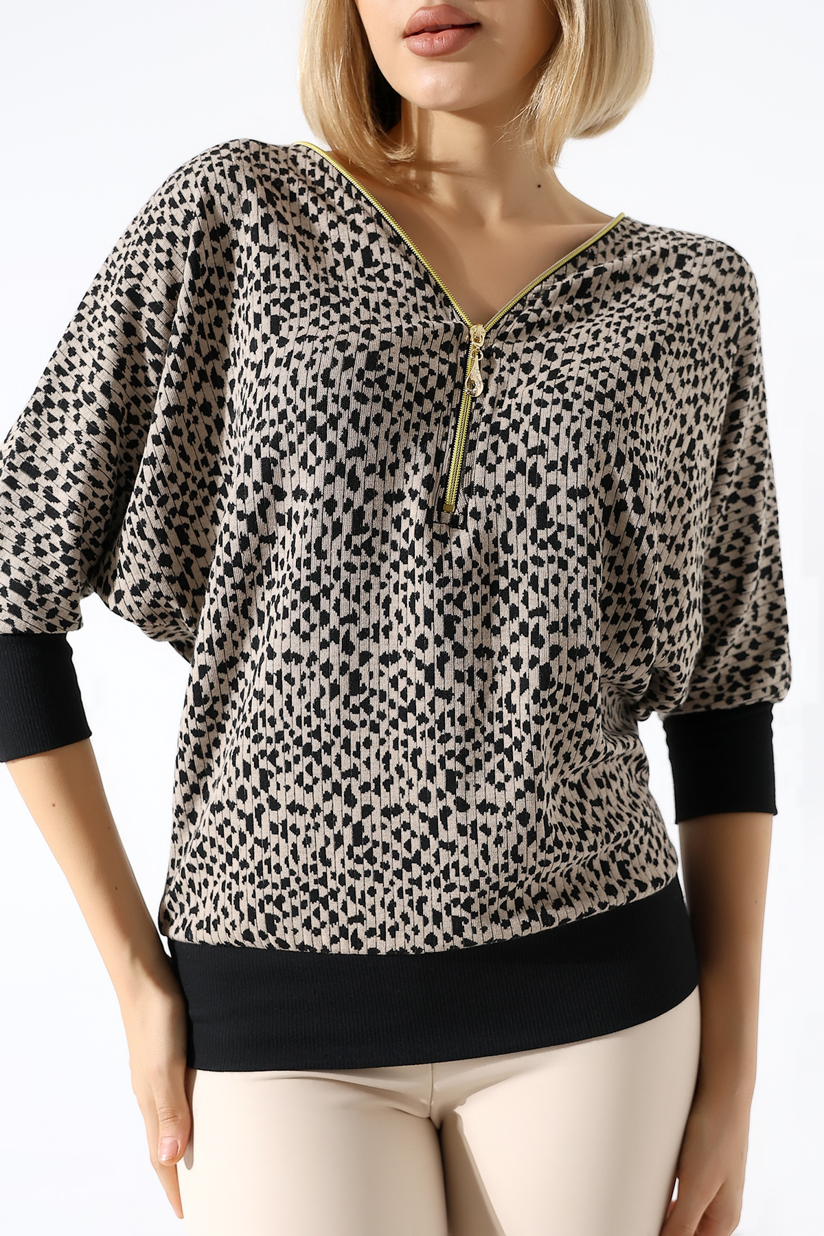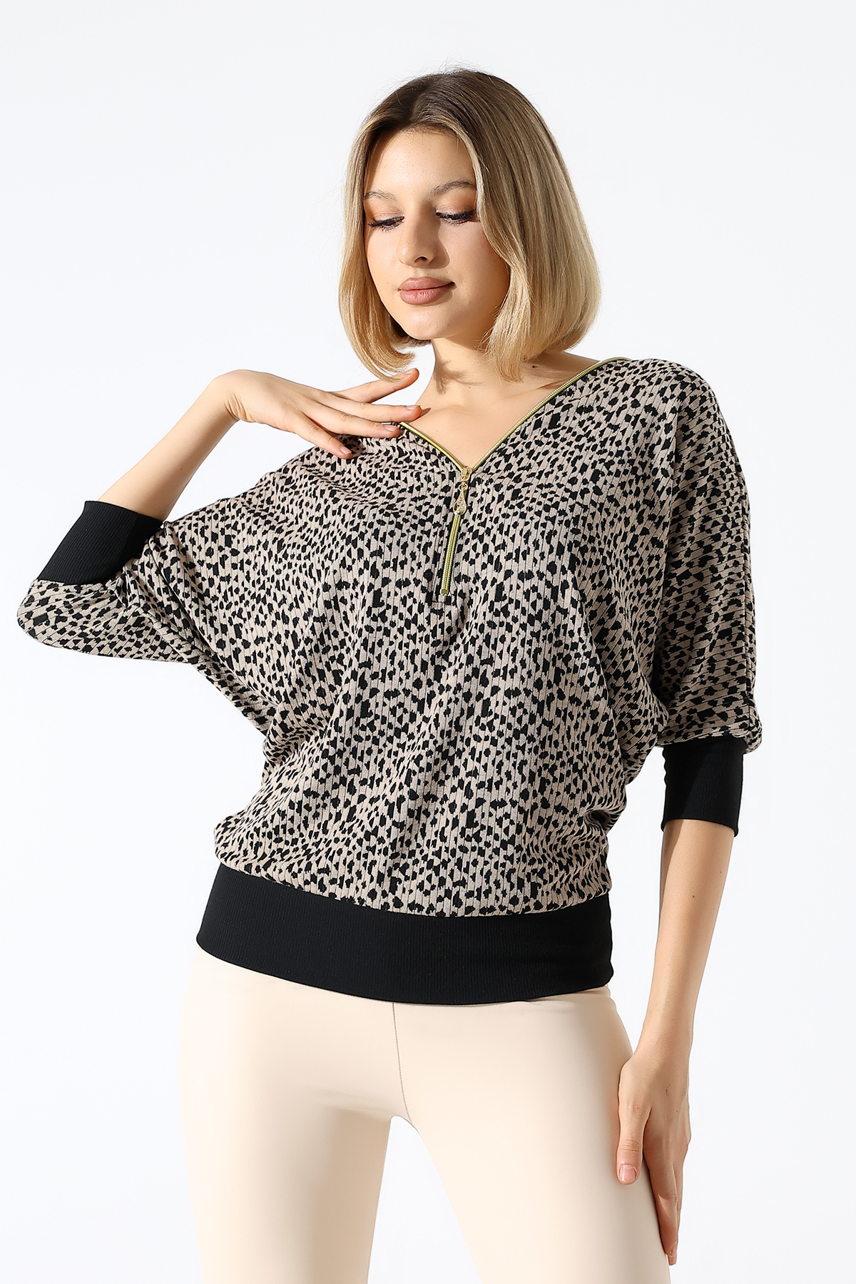 RUNDU Kadın Fermuar Detaylı Yarasa Truvakar Kollu Leopar Jakarlı Örme Bluz & Penye Bluz - Bej RUNDU Kadın Fermuar Detaylı Yarasa Truvakar Kollu Leopar Jakarlı Örme Bluz & Penye Bluz - Bej 4012 2