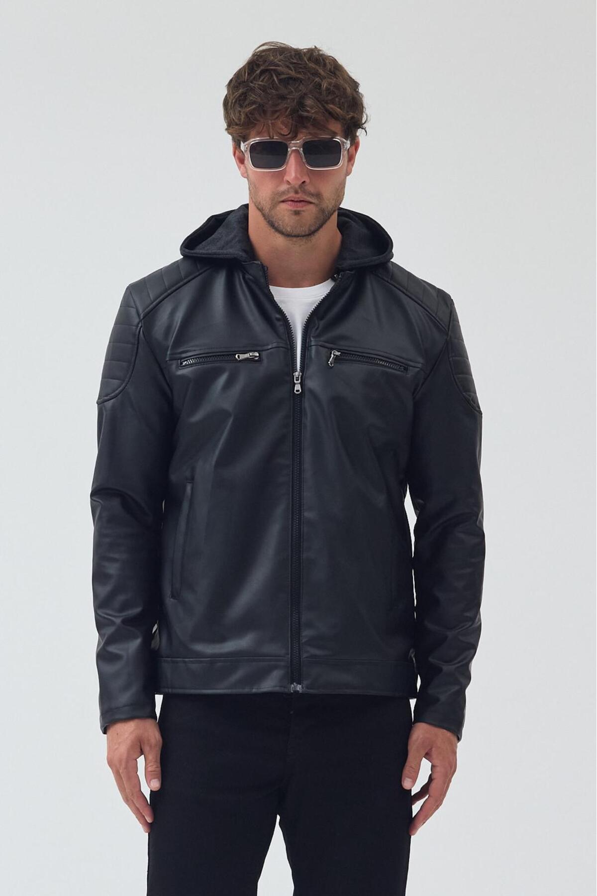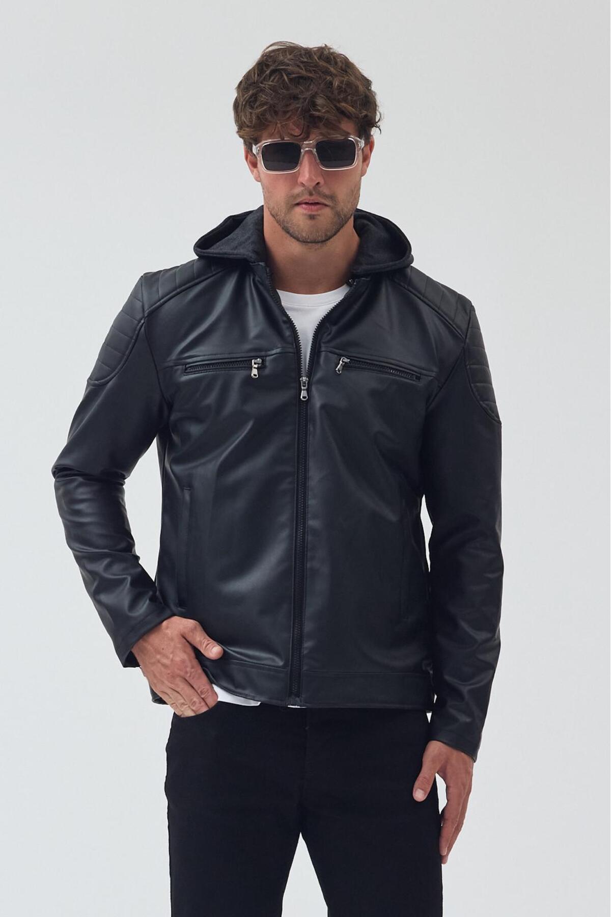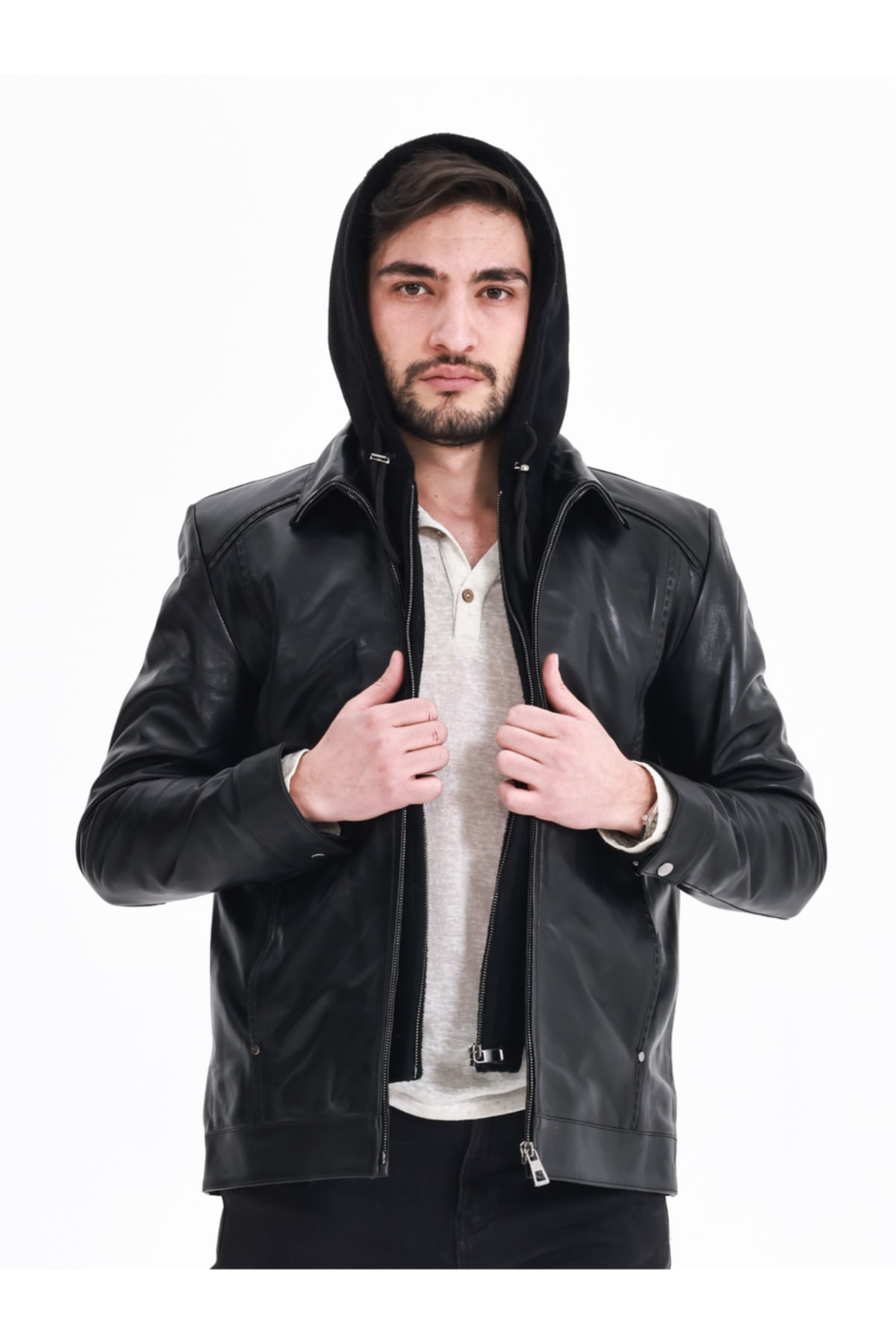 Kapüşonlu Dar Kesim Erkek Siyah Deri Ceket Kapüşonlu Dar Kesim Erkek Siyah Deri Ceket Tuçi-1006 2XL