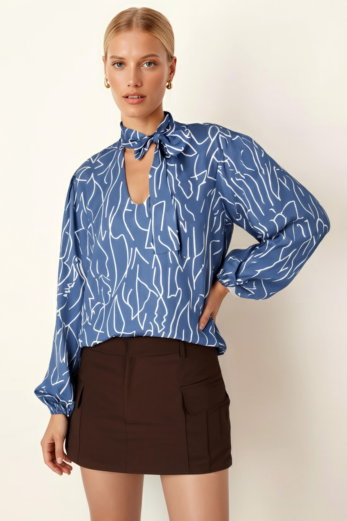 Kadın Koyu Mavi Yakası Bağlamalı Kolu Lastikli Bluz ARM-25K001096 Kadın Koyu Mavi Yakası Bağlamalı Kolu Lastikli Bluz ARM-25K001096 XL