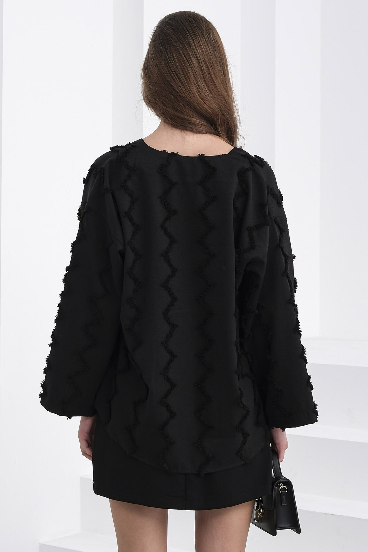 Kadın Siyah Bağlama Detaylı Zigzag Desenli Bluz Vs01236 Kadın Siyah Bağlama Detaylı Zigzag Desenli Bluz Vs01236 VS01236 L