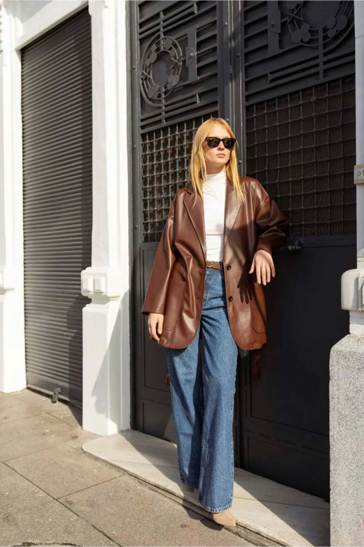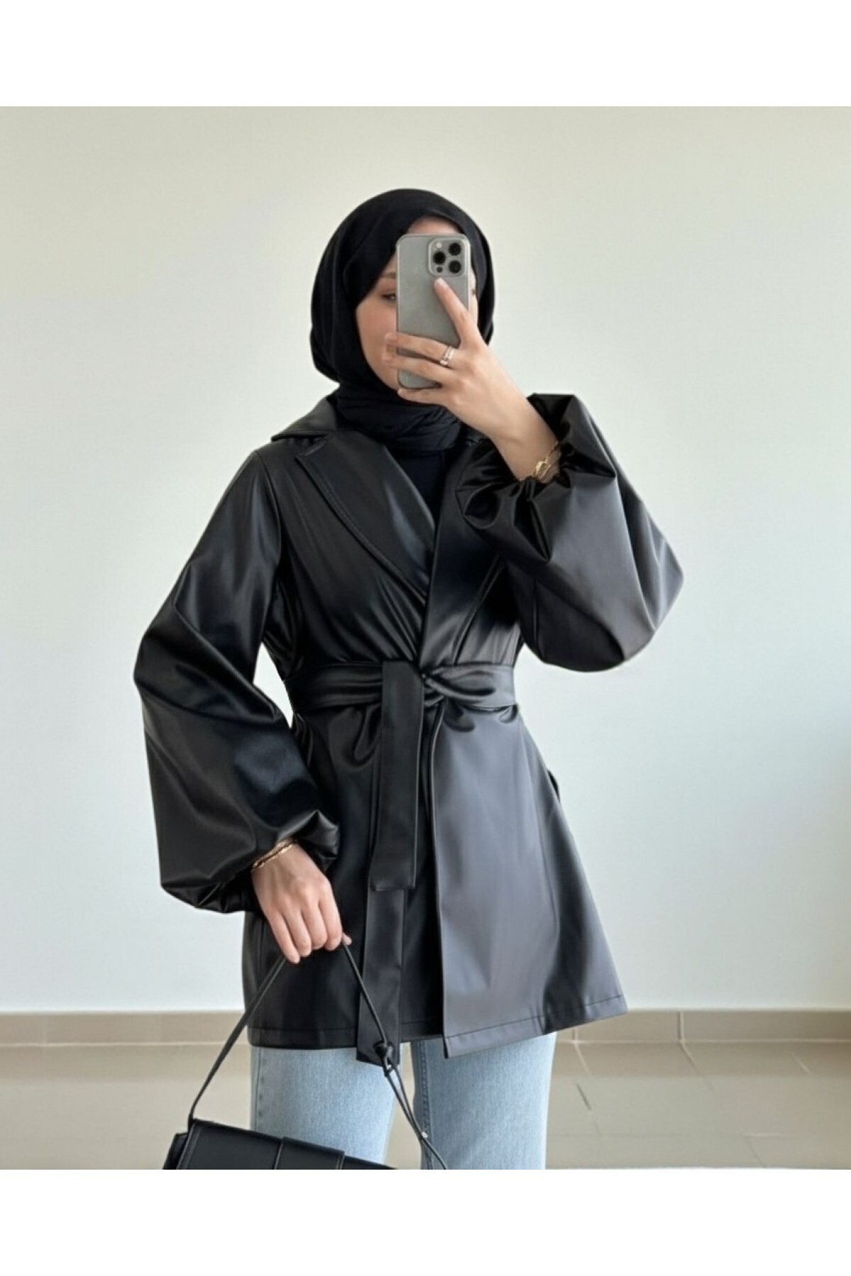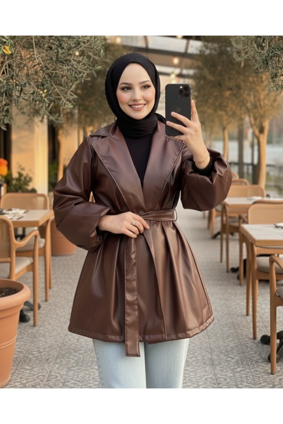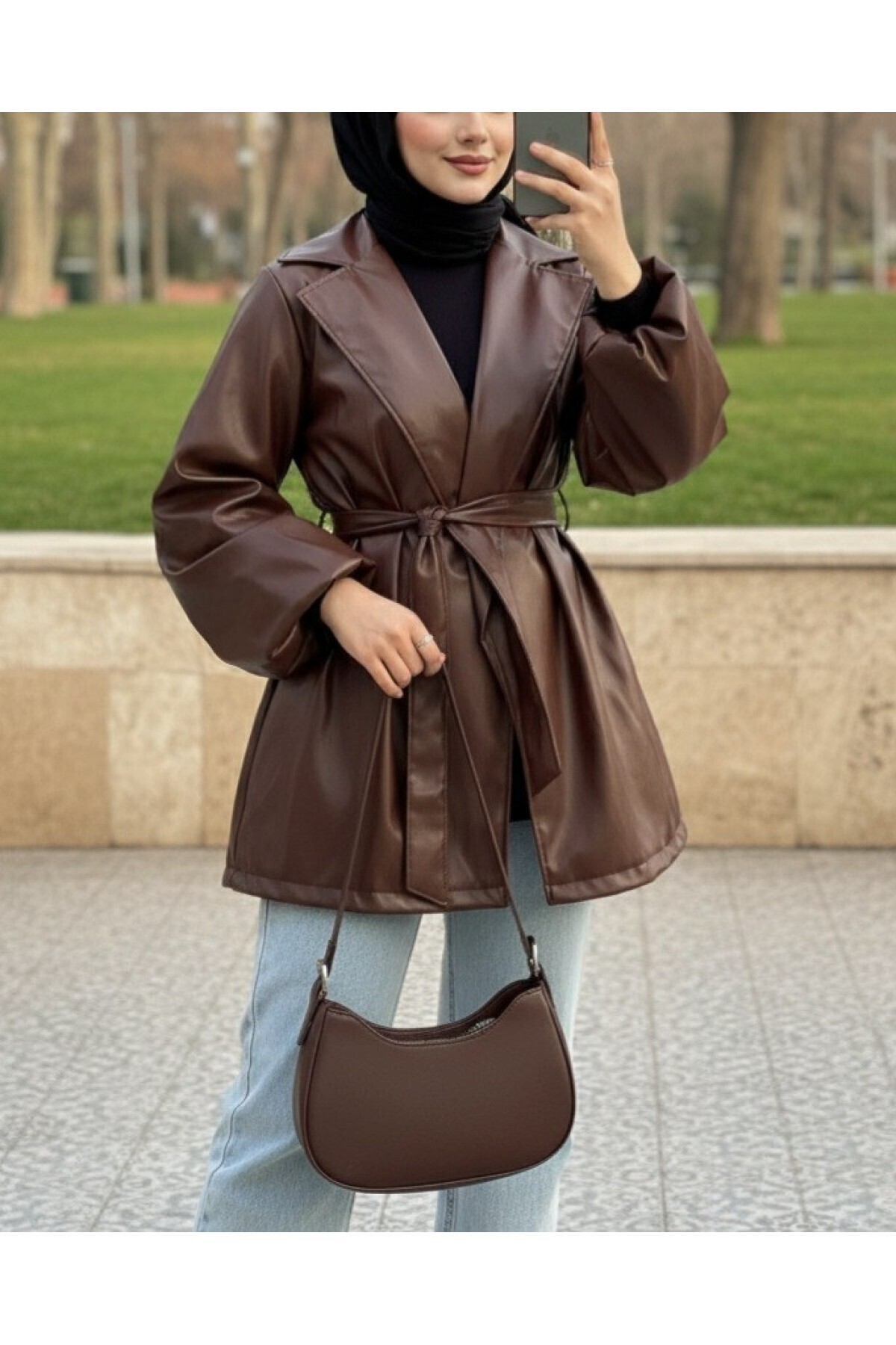 Balon Kol Kemerli Deri Ceket -Kahve Balon Kol Kemerli Deri Ceket -Kahve TY223-3065 تک سایز