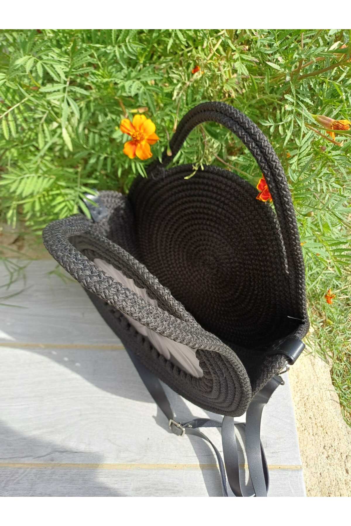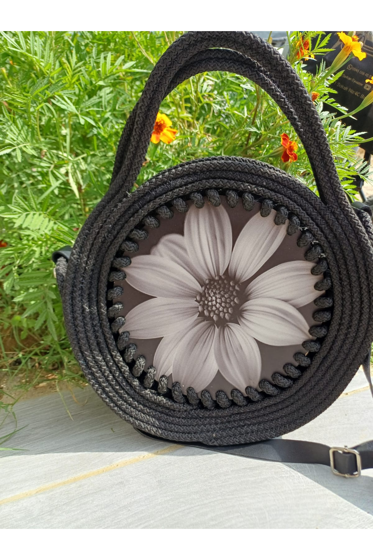El Yapımı Siyah Halat Örgü Yuvarlak Çanta, Siyah-Beyaz Çiçek Desenli Omuz Çantası El Yapımı Siyah Halat Örgü Yuvarlak Çanta, Siyah-Beyaz Çiçek Desenli Omuz Çantası DUY16 Standart