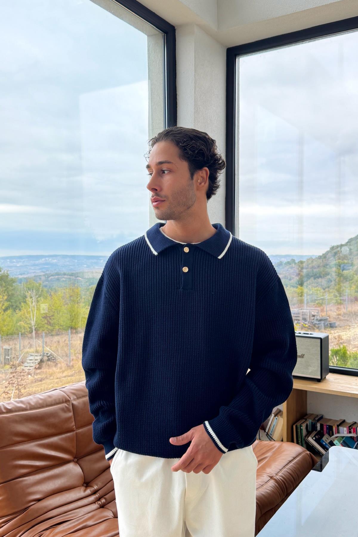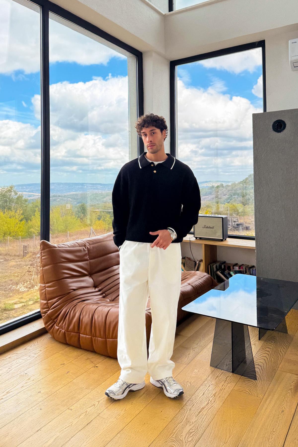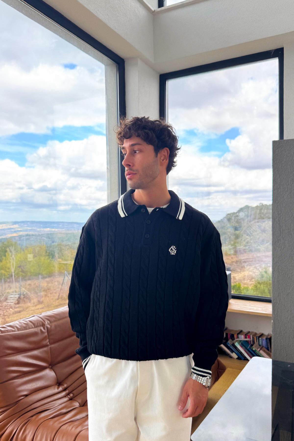 Düğmeli Polo Yaka Siyah Triko Kazak Düğmeli Polo Yaka Siyah Triko Kazak FLAW-021-007-009 XL