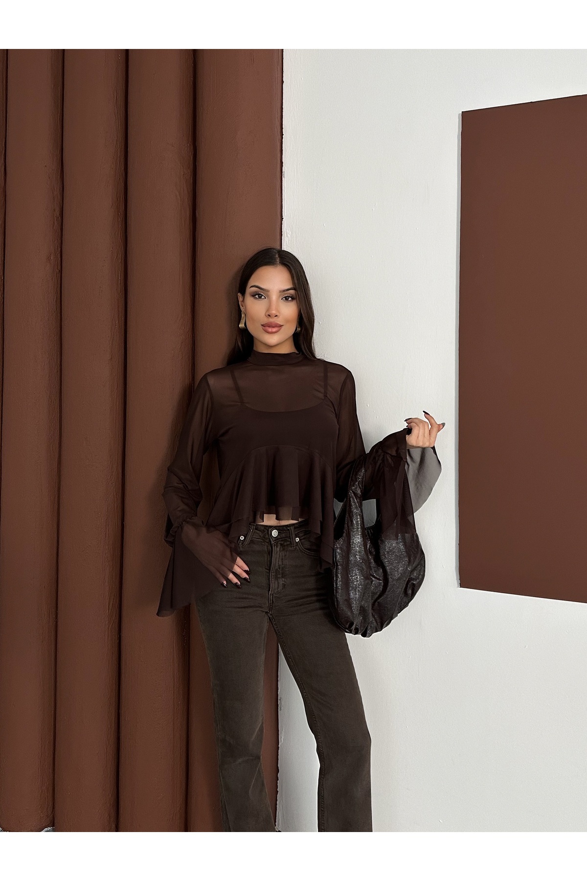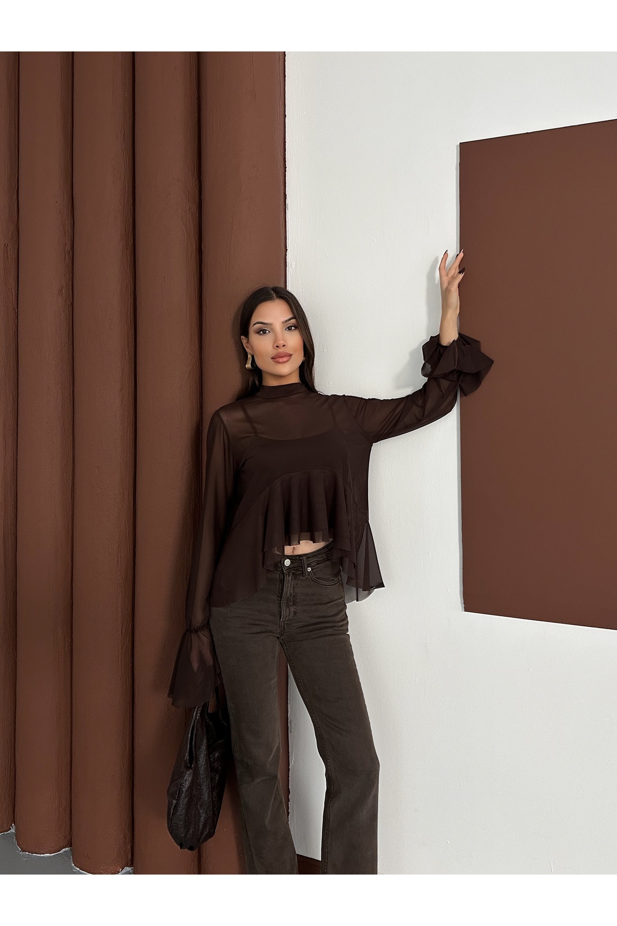 Kadın Kahverengi Yakası Fularlı Fırfır Detaylı Tül Bluz Kadın Kahverengi Yakası Fularlı Fırfır Detaylı Tül Bluz UM2062 L