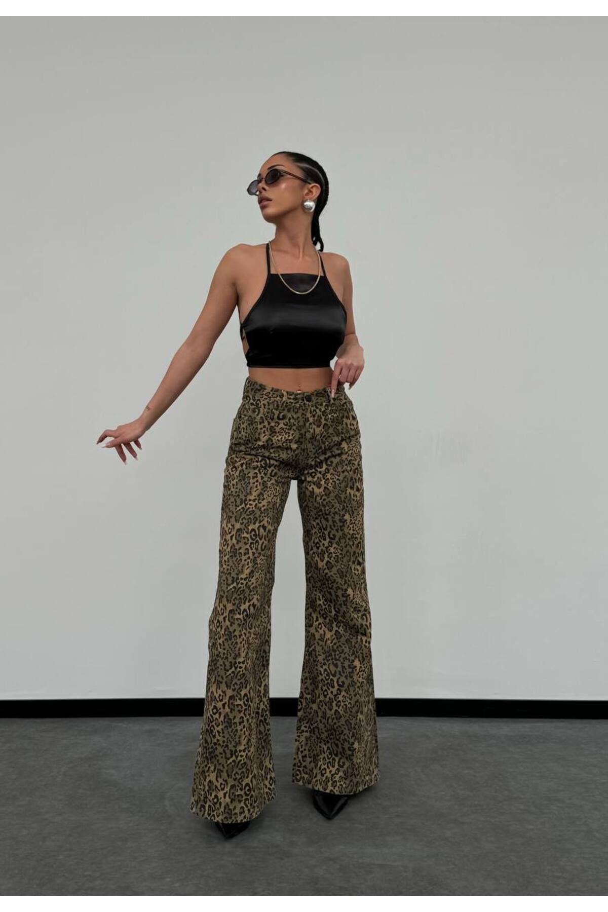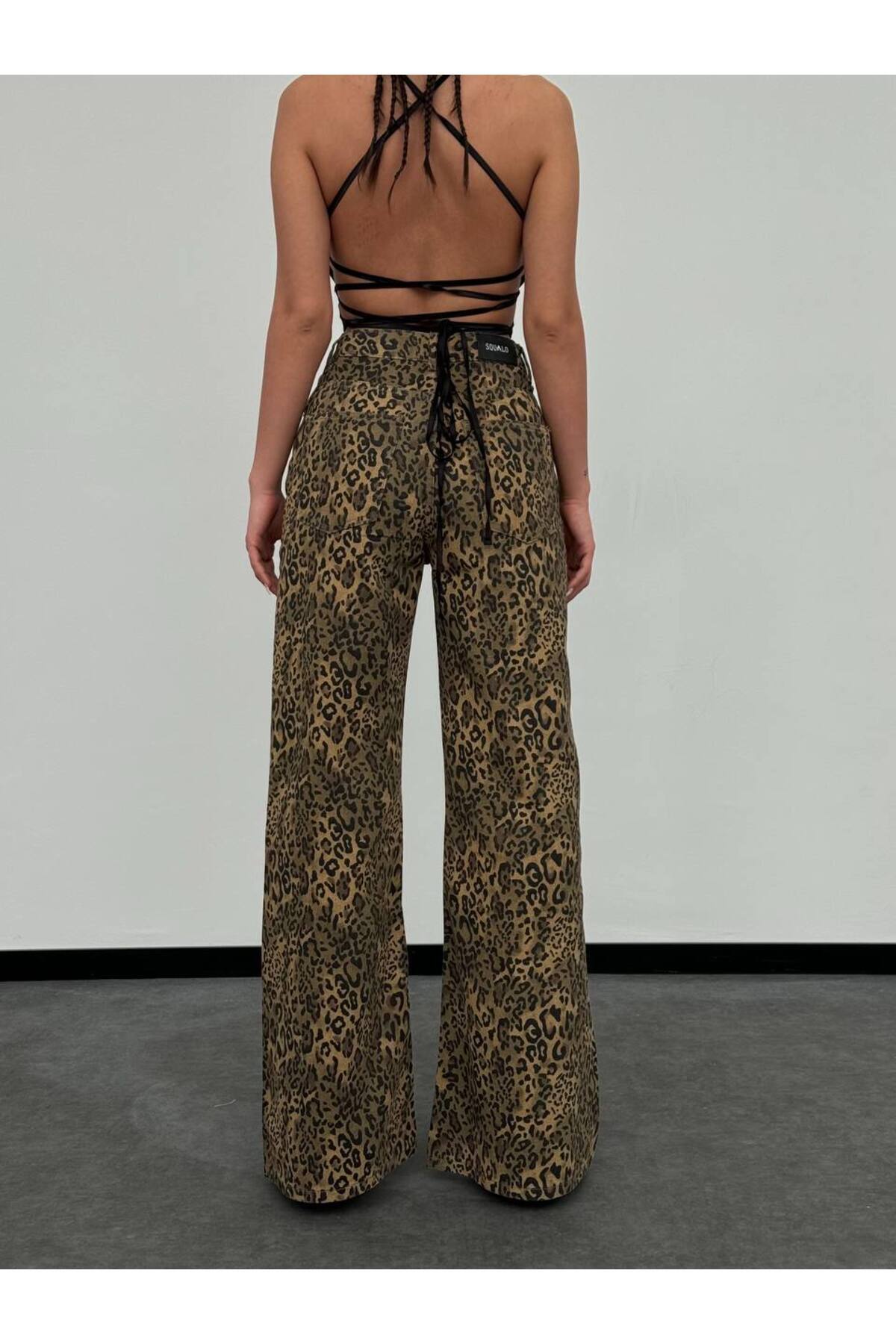Klasik Leopar Desenli Yüksek Bel Bol Paça Jean Pantolon Klasik Leopar Desenli Yüksek Bel Bol Paça Jean Pantolon 1302-6