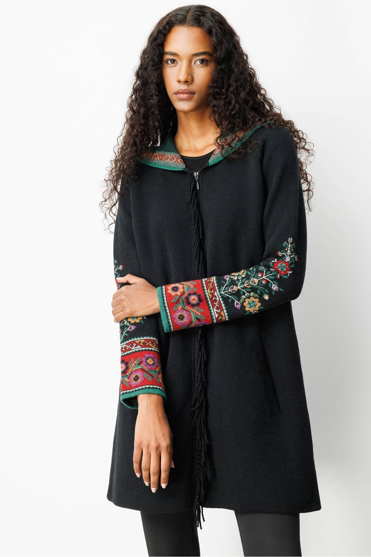Kadın Kapüşonlu Kilim Jakarlı Püsküllü Yün Kaban Siyah Kadın Kapüşonlu Kilim Jakarlı Püsküllü Yün Kaban Siyah 25056 XL