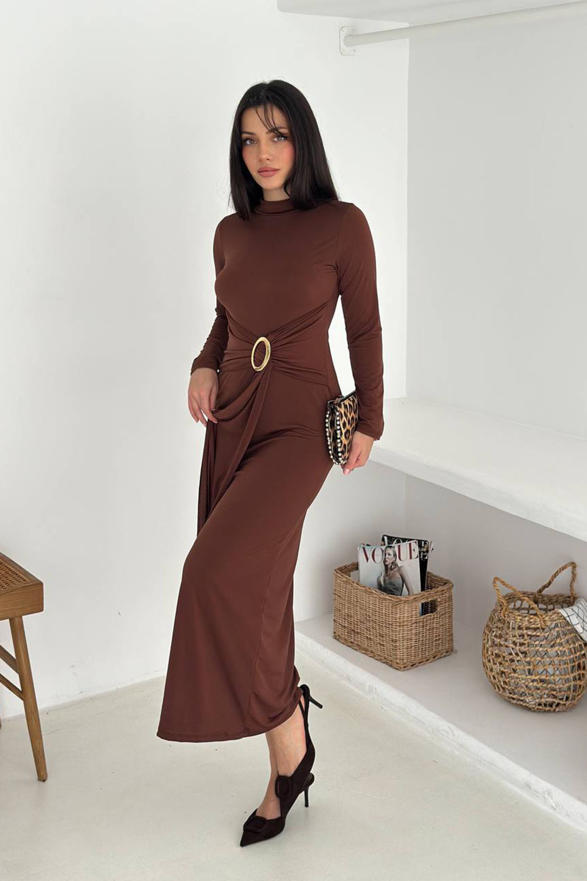 kadın toka detaylı drapeli midi elbise NBK4351 kadın toka detaylı drapeli midi elbise NBK4351 42