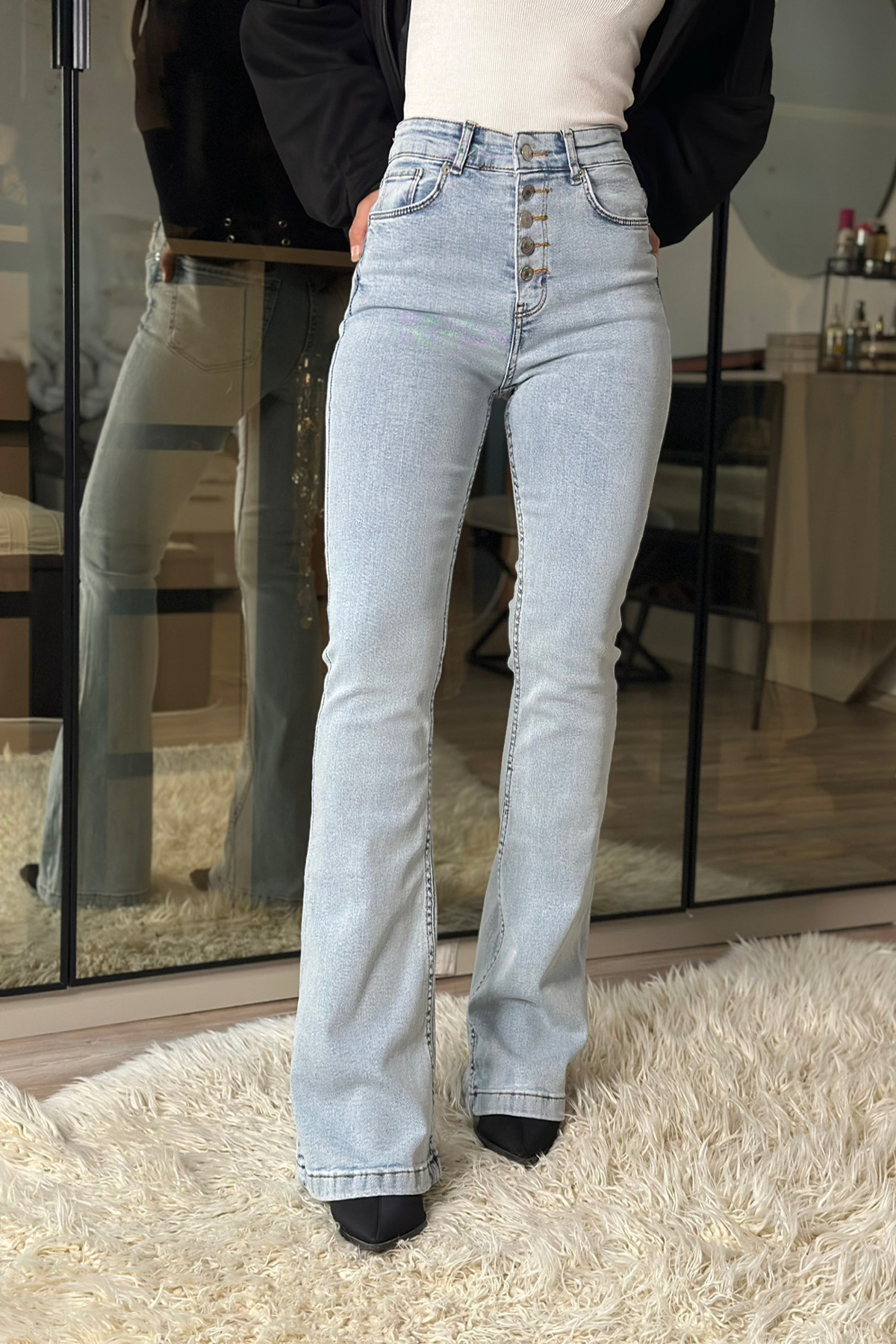 Düğme Detaylı Likralı Yüksek Bel İspanyol Paça Toparlayıcı Buz Mavisi Jean Düğme Detaylı Likralı Yüksek Bel İspanyol Paça Toparlayıcı Buz Mavisi Jean Beyys-İspanyol-Jean XS/34