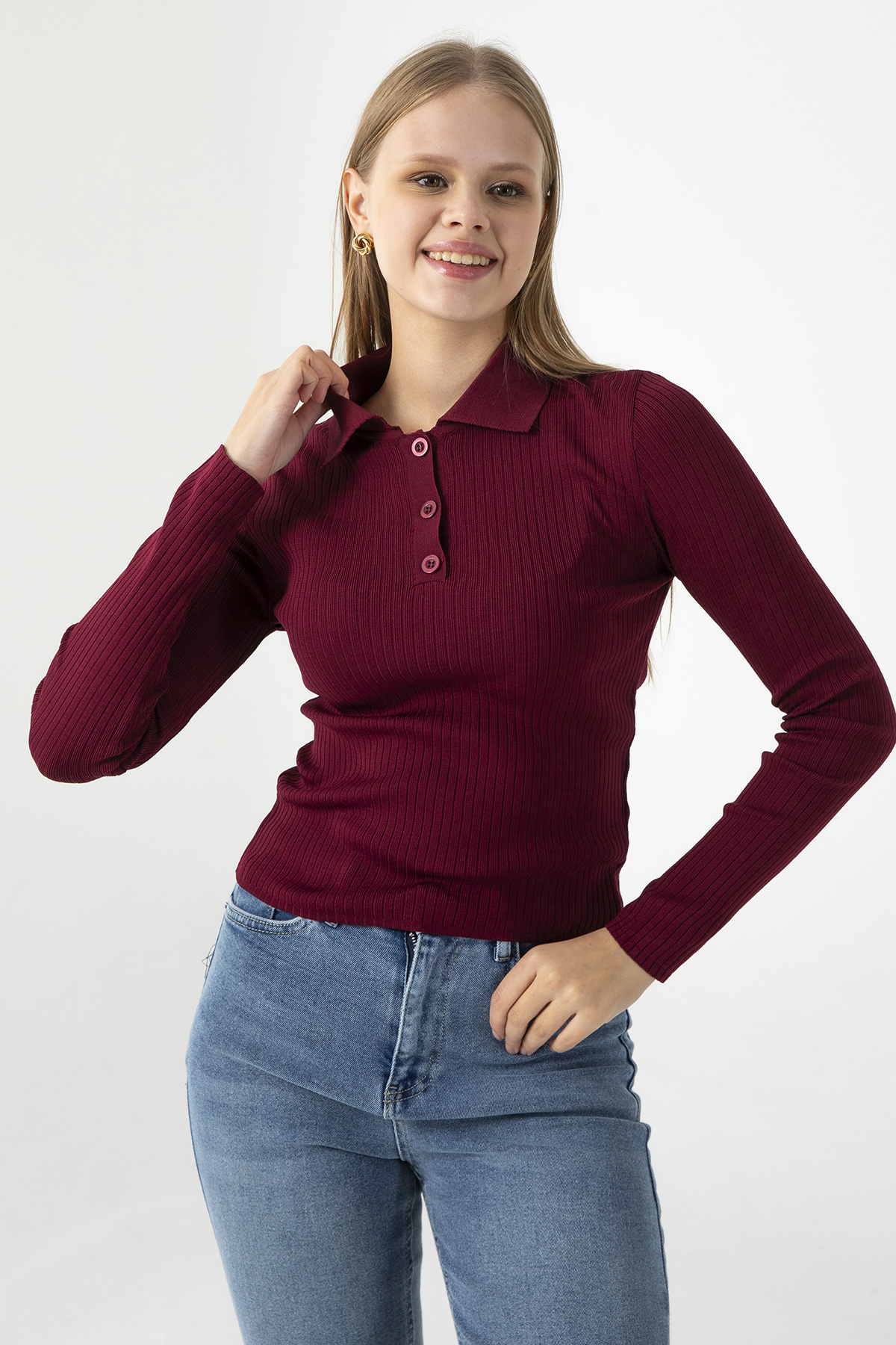 Kadın Polo Yaka Düğme Detaylı Fitilli Triko Body Bordo - 25K 2057 Kadın Polo Yaka Düğme Detaylı Fitilli Triko Body Bordo - 25K 2057 1681-25K2057 تک سایز