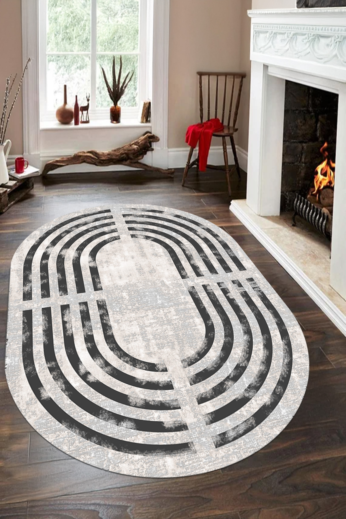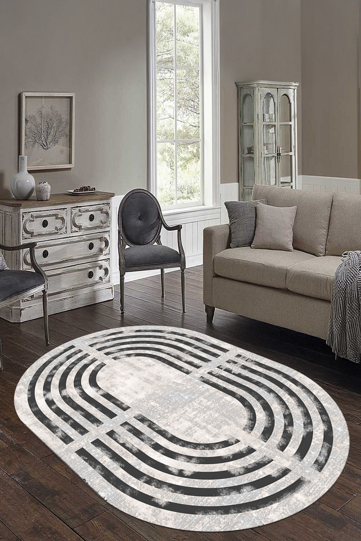 مشخصات فنی Dijital Baskılı Yıkanabilir ve Kaymaz Tabanlı Sade Eskitme Desenli Çerçeveli Oval Salon Halısı