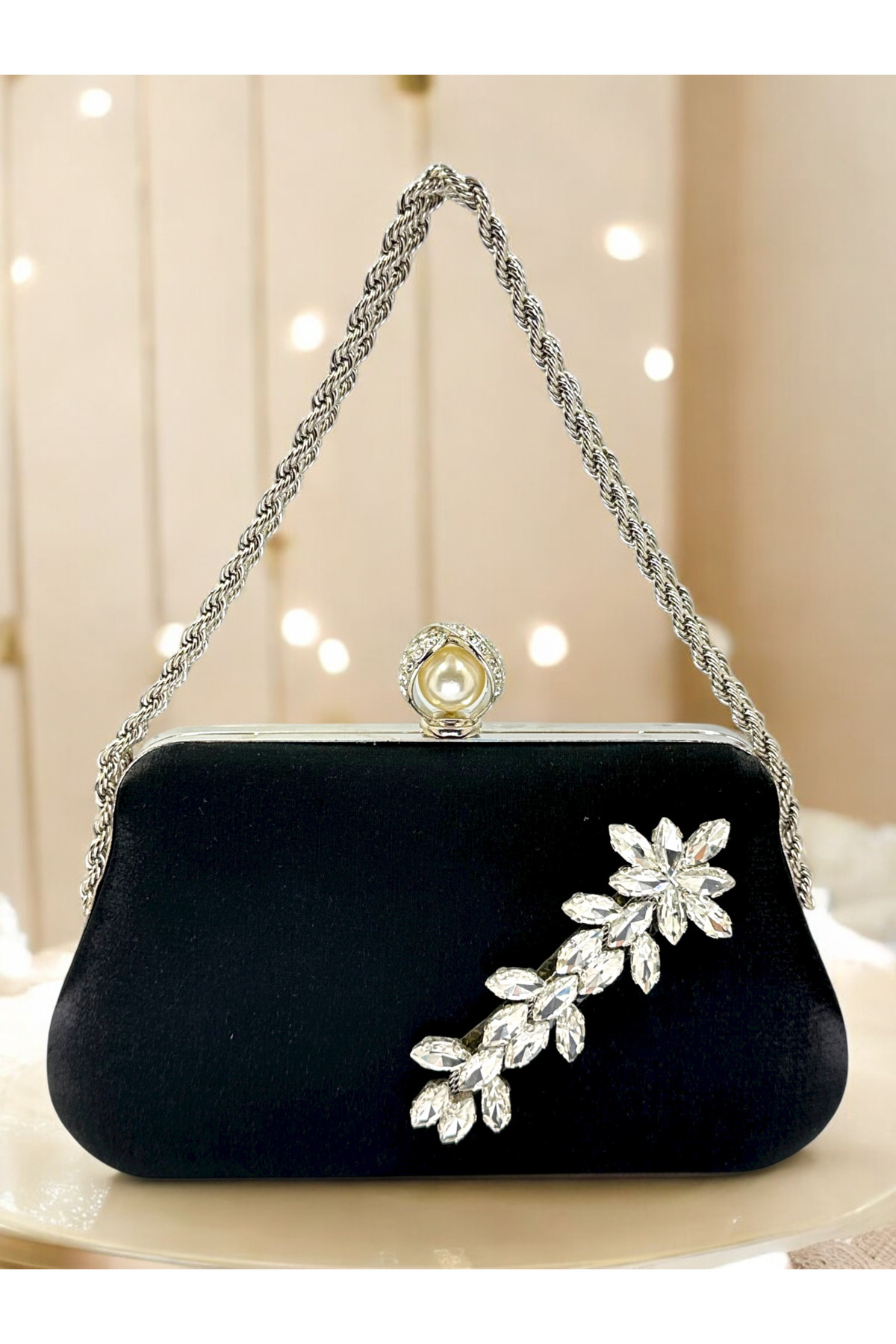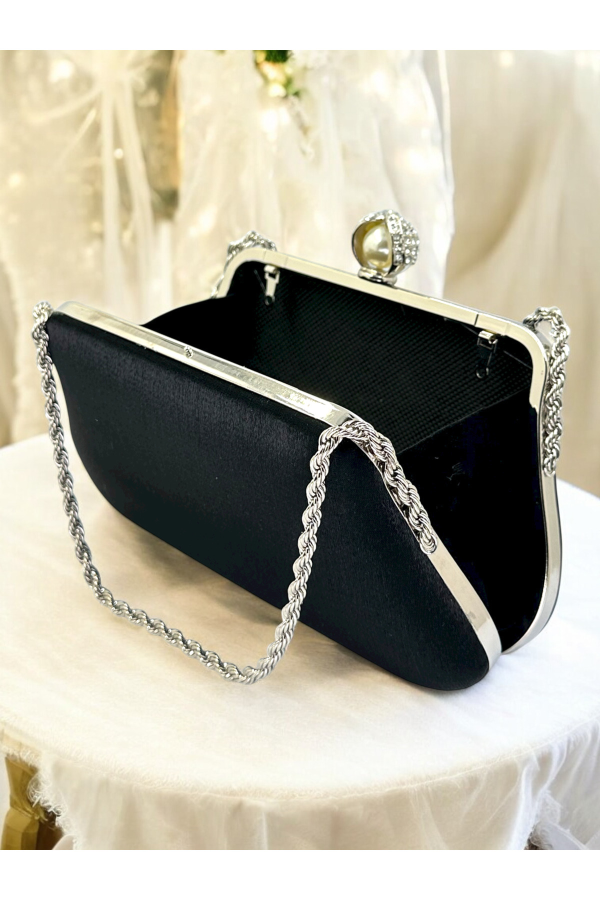 Siyah Renk Simli Saten Gümüş Ve İnci Detaylı Zincir Askılı Kadın Abiye Çanta Düğün Nişan Mezuniyet Siyah Renk Simli Saten Gümüş Ve İnci Detaylı Zincir Askılı Kadın Abiye Çanta Düğün Nişan Mezuniyet 142-25 تک سایز